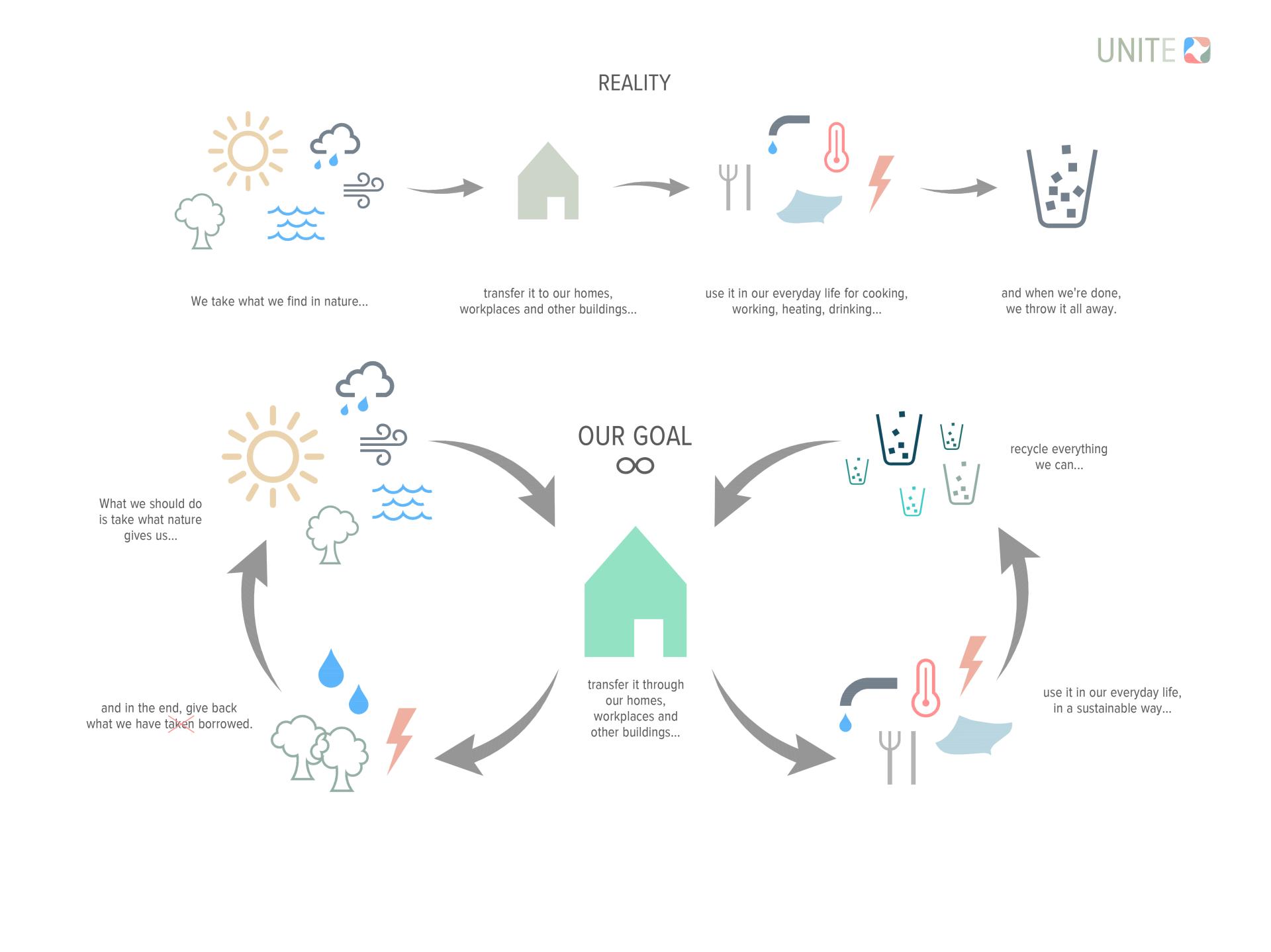 The starting point of this project was to determine which major issues are present and what caused them. The pace by which we are destroying our environment has taken up in the last few decades and global warming has become a priority issue. By using renewable resources and innovative materials in architecture we can significantly affect the current state of nature. Establishing the renewable resources we have available now - or will have in the near future - and how they can be used in a building was the following task. Our target was also to give something back to our planet - to reduce as many harmful effects as we can in one swipe.