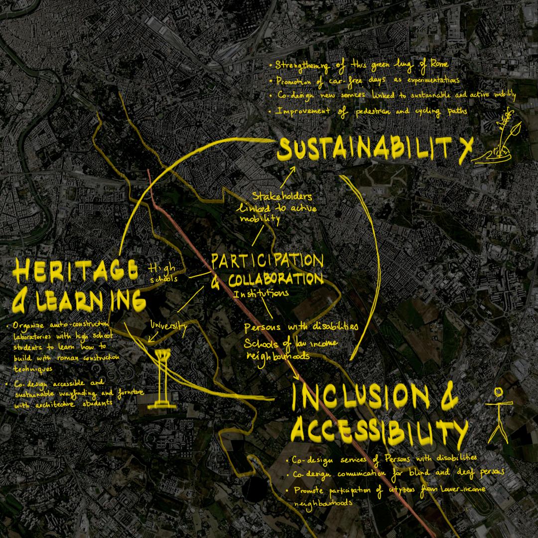 The Roman Appian Way is an example of this dichotomy. On the one hand, it is one of the green lungs of Rome and it is an astonishing piece of art history. On the other hand, it is full of cars and it is accessible just for some people. From our point of view, both aspects need to find a way to match.