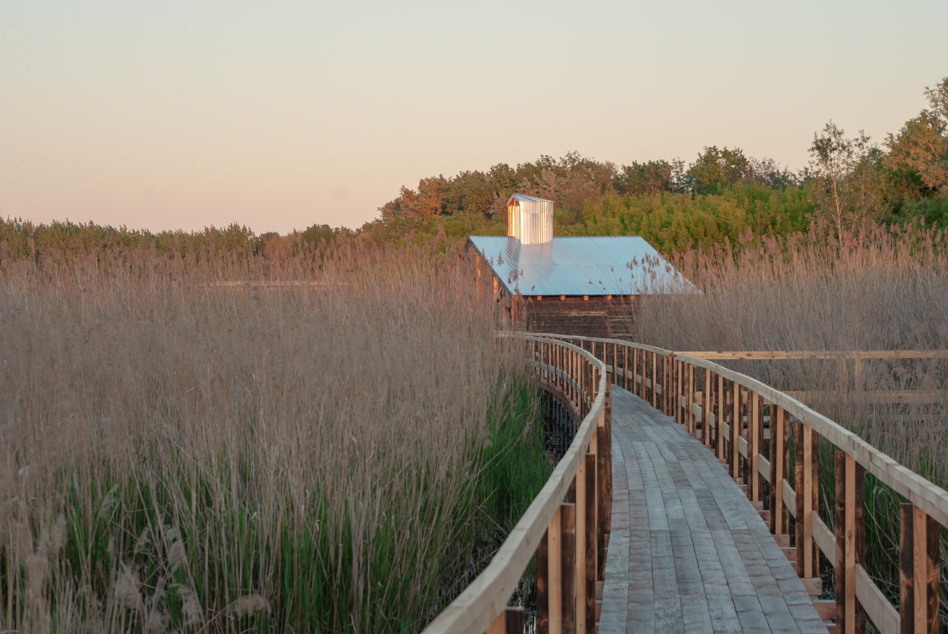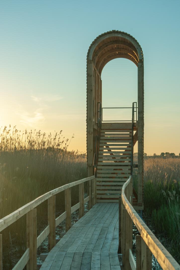 The project is a Natural and Cultural rehabilitation initiative and an educational trail in a small countryside town in south Hungary. The aim of the effort is to recultivate a used to be open-lake natural habitat with local buffalos and with their work on the landscape. We have defined a 500 meter long curved path with a 500 meter radius, on which we placed a few objects for observing nature: one buffalo barn, three little installations to enjoy the landscape through framing it, and a viewpoint at the end. Thanks to the giant curved shape of the path these objects can be revealed in a direct order for the visitors, while the whole structure can be observed only from the viewpoint.