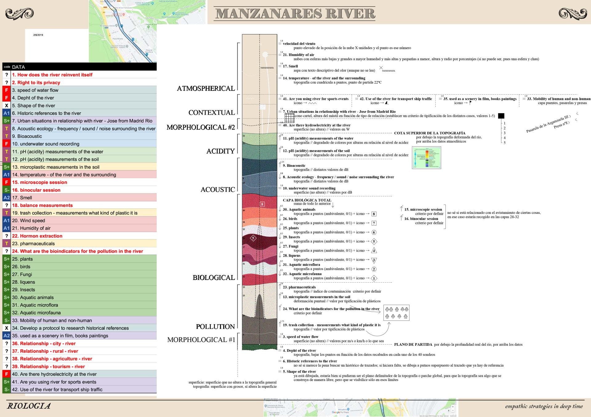 The idea of the river as “a frontier space” brought forth in the project Riología | Empathic strategies of deep time is embedded in the métier of the Mutant Institute of Environmental Narratives, which views the river as the axis of city transformation, and in the theoretical framework of “post-nature”. The aim of the project is to develop a model for a collective exercise of approaching the Manzanares River, one that will also serve as the basis for similar attempts at approaching other river ecosystems in the future.