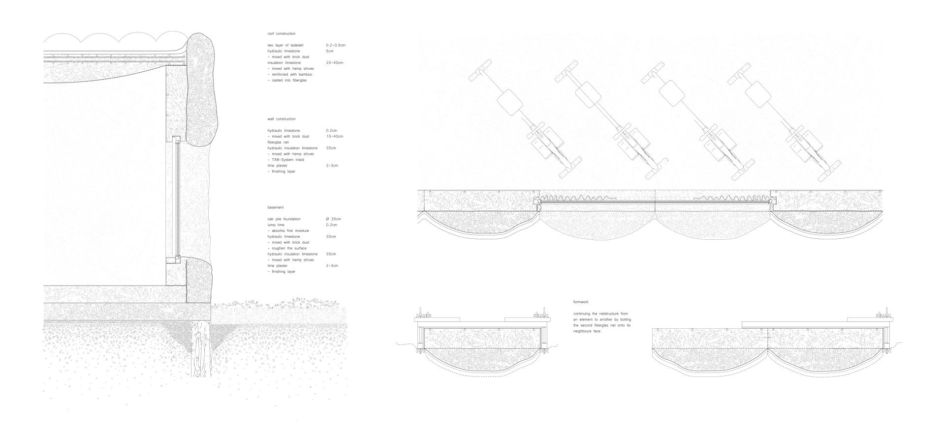 The design is an experimental attempt to rethink the building material -lime- in terms of its material gesture and to transpose lime in its purest possible form. Having the material „very present at all time“ was the idea of re-using the excavation on site as the actual building material. The challenge was further the understanding of what is already there and how materials take impact towards design and the general attitude as an architect. Therefore all of the excavated materials I found, find themselves back assigned within the construction process.