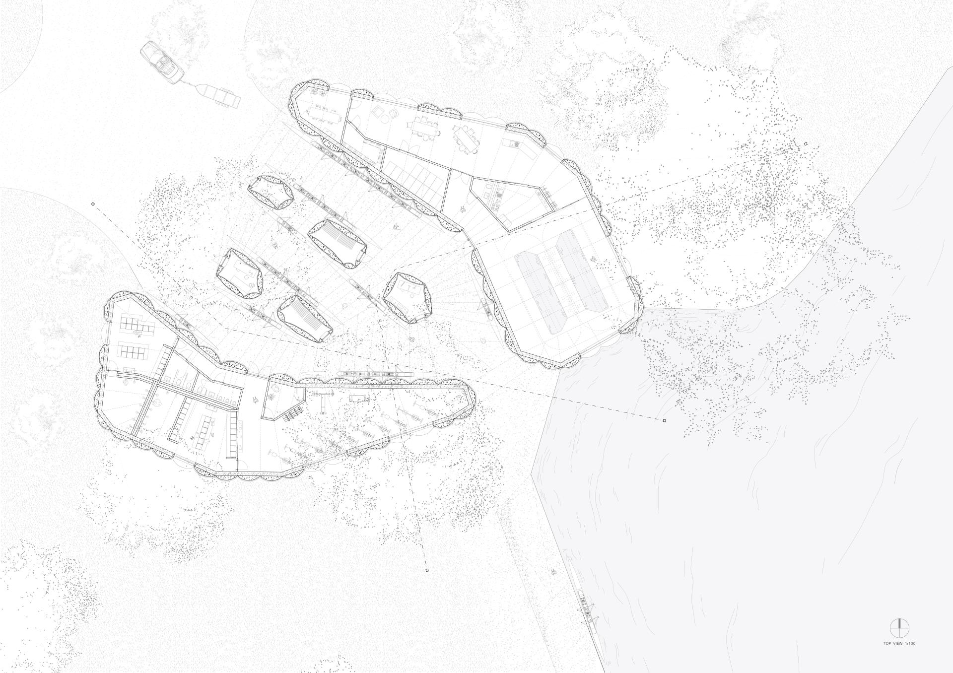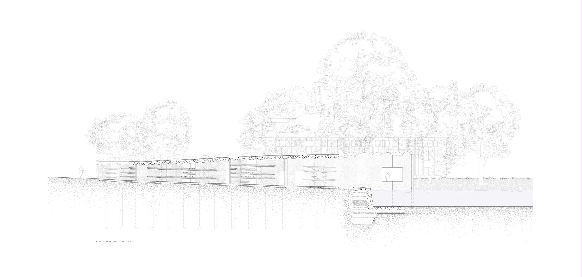 The boat-hall remains shaded, unclosed and open to the public. The club-building confronts every visitor with its local, environmental play to the waterfront, its lake and in addition with its wonderful sport of rowing. The emerged form is defined by the trees and curles around them on site. No tree will be felled to reach the desired new qualities for „Lacustrine“.