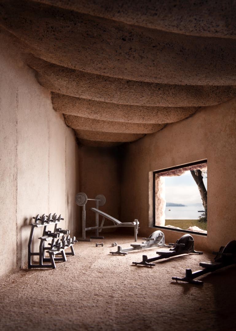 The final process of making will be shown very direct and defines the expression of the building: The mortar putty is prepared, mixed and casted on site into fiberglas nets and when these are later removed, a stony, warped and distorted outside layer remains. The outdoor layer with its curves and bows assists directly the functional storing of rowing boats in between the spatial volumes.