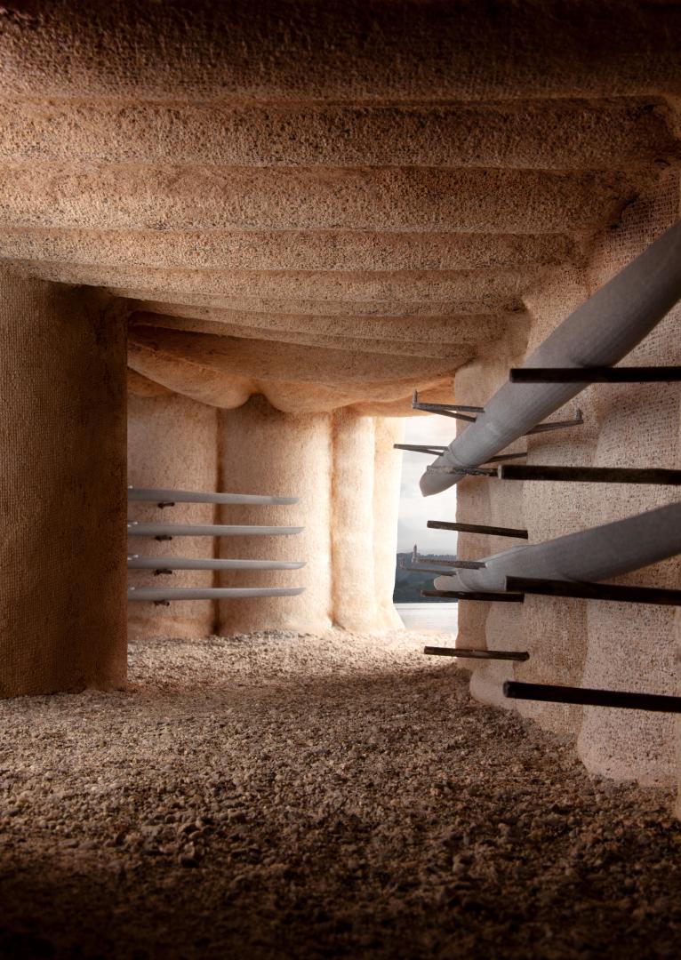 At every stage of the design process, no other structural components were used except limestone. Simply because limestone only can take up onto compression forces, the inlayed bamboo can be understood as a fabric which ties together the actual casted limestone. Seen as actual reinforcement and formwork at the same time, the composite is able to span the boat hall from six to seven meters.