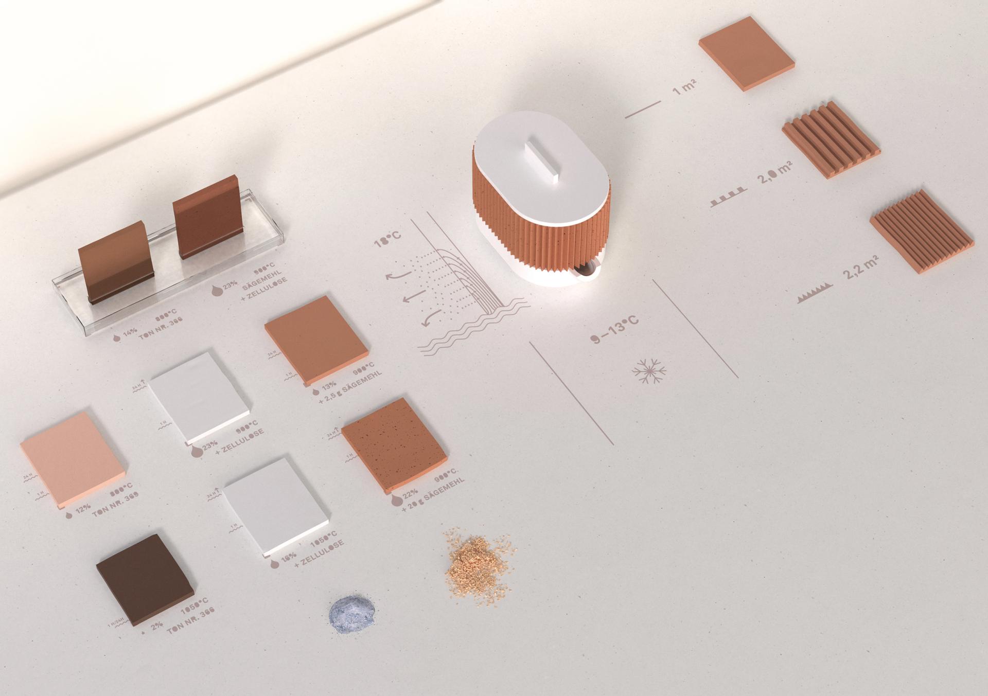 COOLING BRICKS consist of a water basin, a lid, shelves and the Poroton, which evaporates the water. Due to the modular design, broken parts can be replaced. In order to achieve a high capillarity, sawdust and papermaking sludge are used as clay fillers. Both are renewable raw materials that occur as waste products in the industry. They burn when the clay is fired, thereby reducing its weight while its volume remains the same. Clay from a regional clay pit is used to save transport distances.