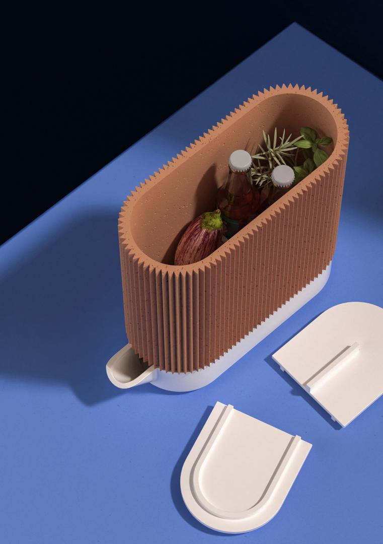 A special focus was given to how an ancient technology can be transformed in such a way that it can be both aesthetically integrated into a modern kitchen and easily used. In this way, residents of city apartments can bring a formerly often used storage cellar into the apartment in miniature form. The COOLING BRICKS series are three modular cooling vessels. They consist of a water bowl, which can be easily refilled with water via the spout every couple of days. The jagged red clay part, absorbs water, evaporates it and thus cools the vessel. The ribbed surface is aesthetically designed to resemble cooling fins and thus already visually indicates the cooling function to the user. The different shelves on which the cooled food is placed are subdivided by seperators and recesses which are used as handles at the same time. The water reservoir has the additional function of better storage and freshness of certain vegetables and herbs of which the stems or roots can be stored directly in the water and thus remain fresh longer. To prevent cold loss and to be easier to handle, the lids of the large vessels are divided into two parts. The white ceramic is glazed, waterproof and easy to clean and makes a fresh and clean impression. But above all, COOLING BRICKS impresses with the aesthetics of simplicity of this cooling technology that works simply with water and its evaporation.