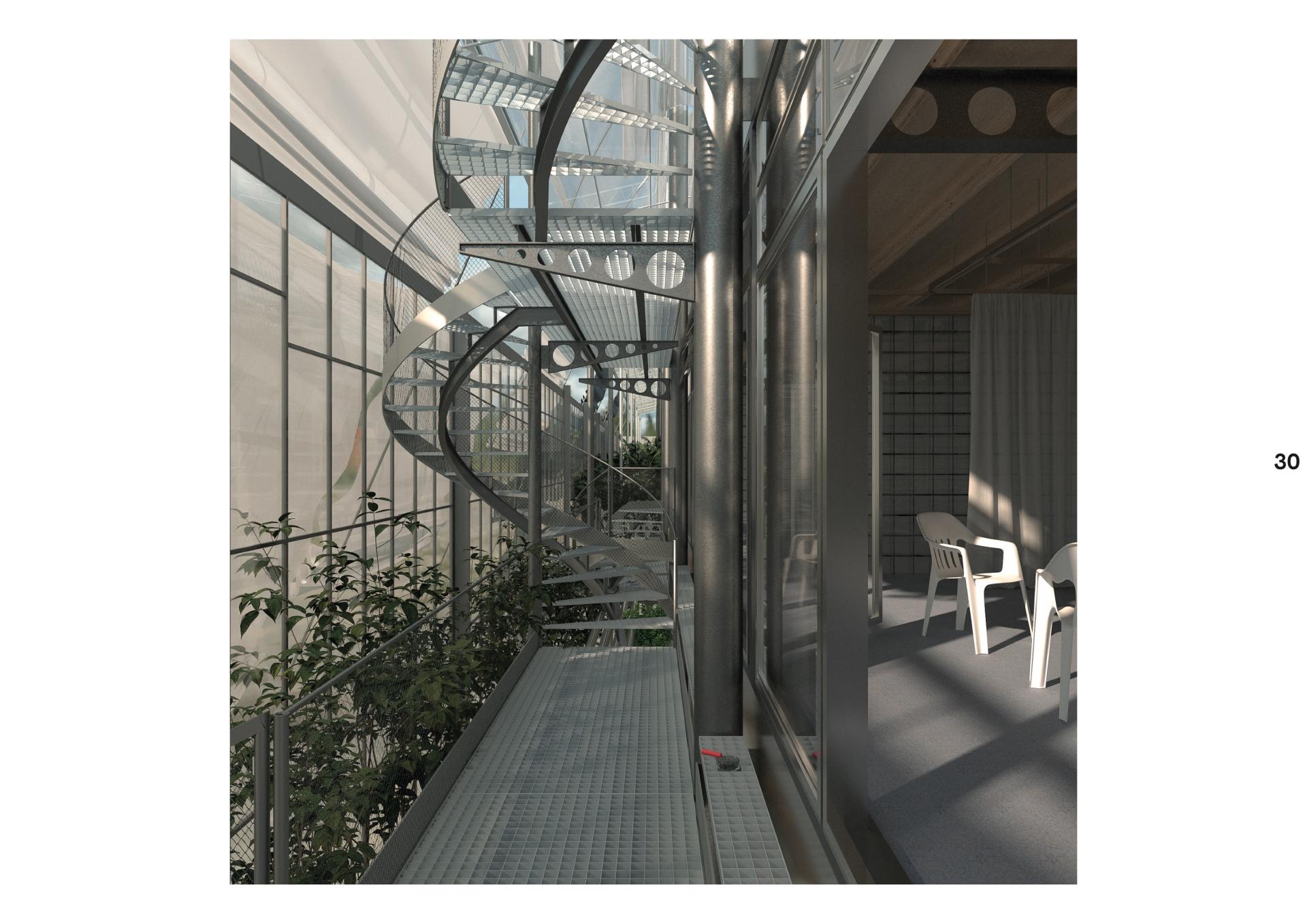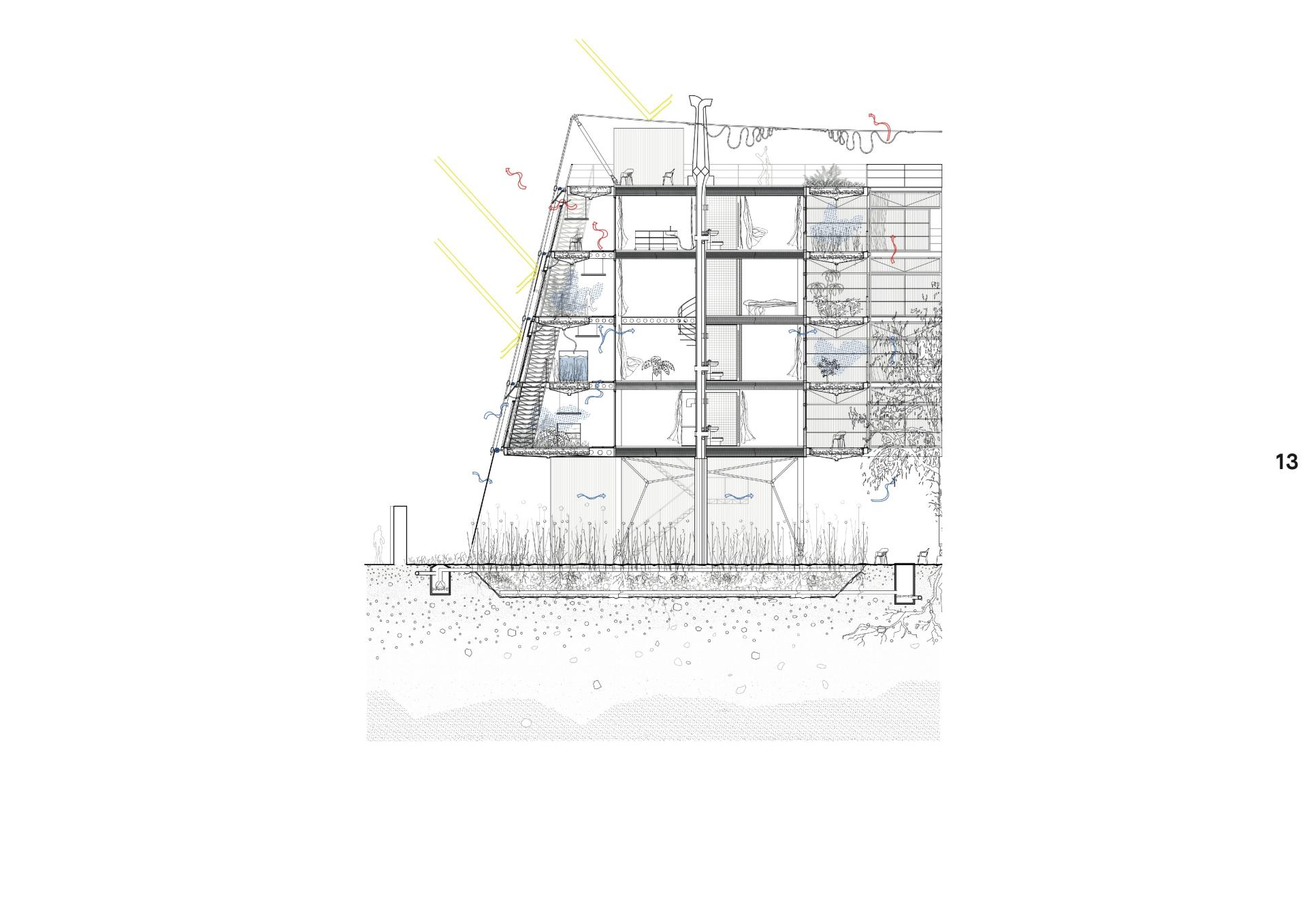 The collected rainwater serves as water storage of the whole ecosystem and can be distributed as utility water. Biomass and fecal matter from the area are fed into the biogas plant through vacuum lines. The biogas can be fed into the municipal grid in a processed form or converted into electricity by the combined heat and power plant. Urine is flushed into the denitrification reactor in the production hall and then cleaned of other harmful substances in an activated carbon filter. The liquid product can be used as plant fertilizer.