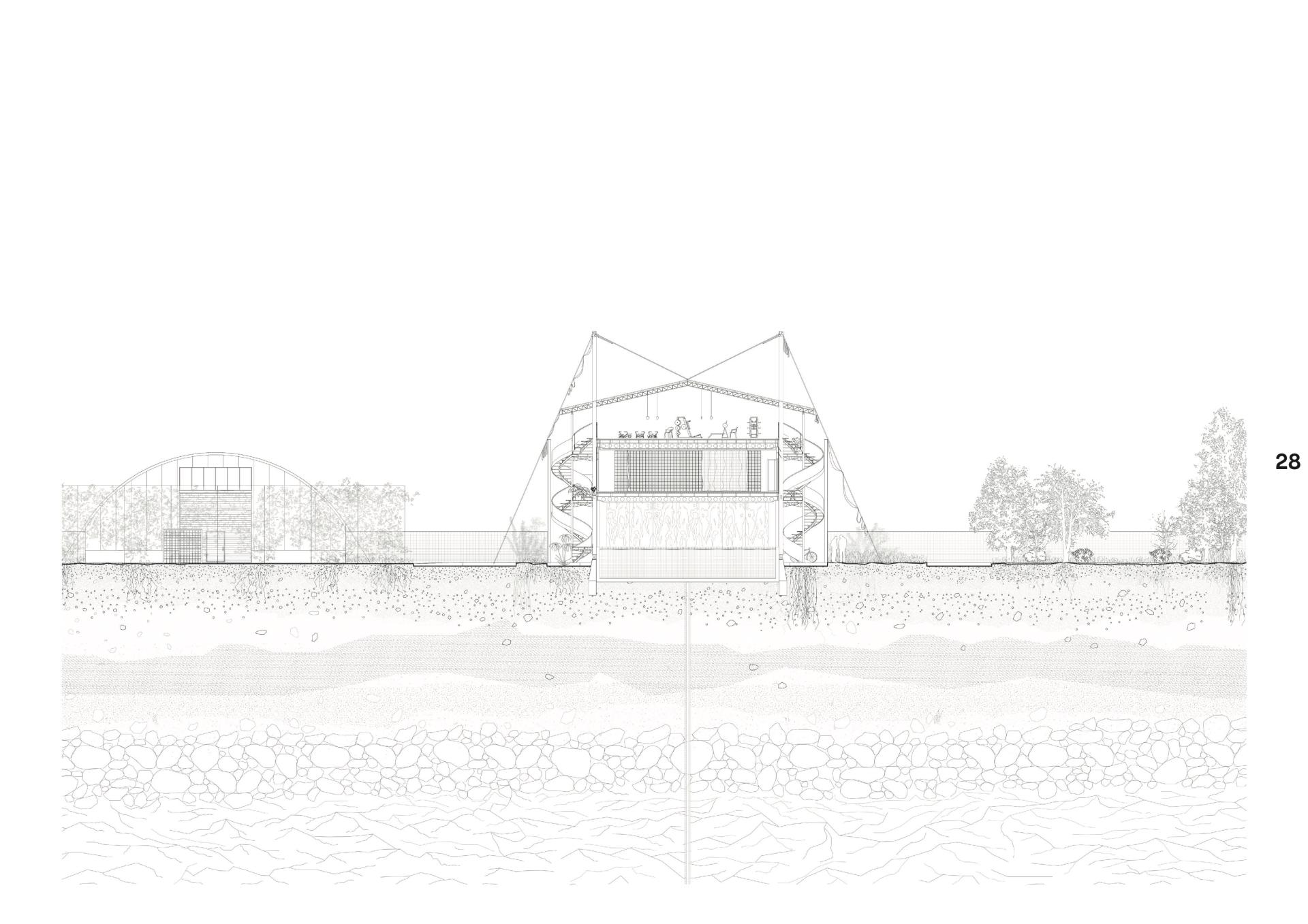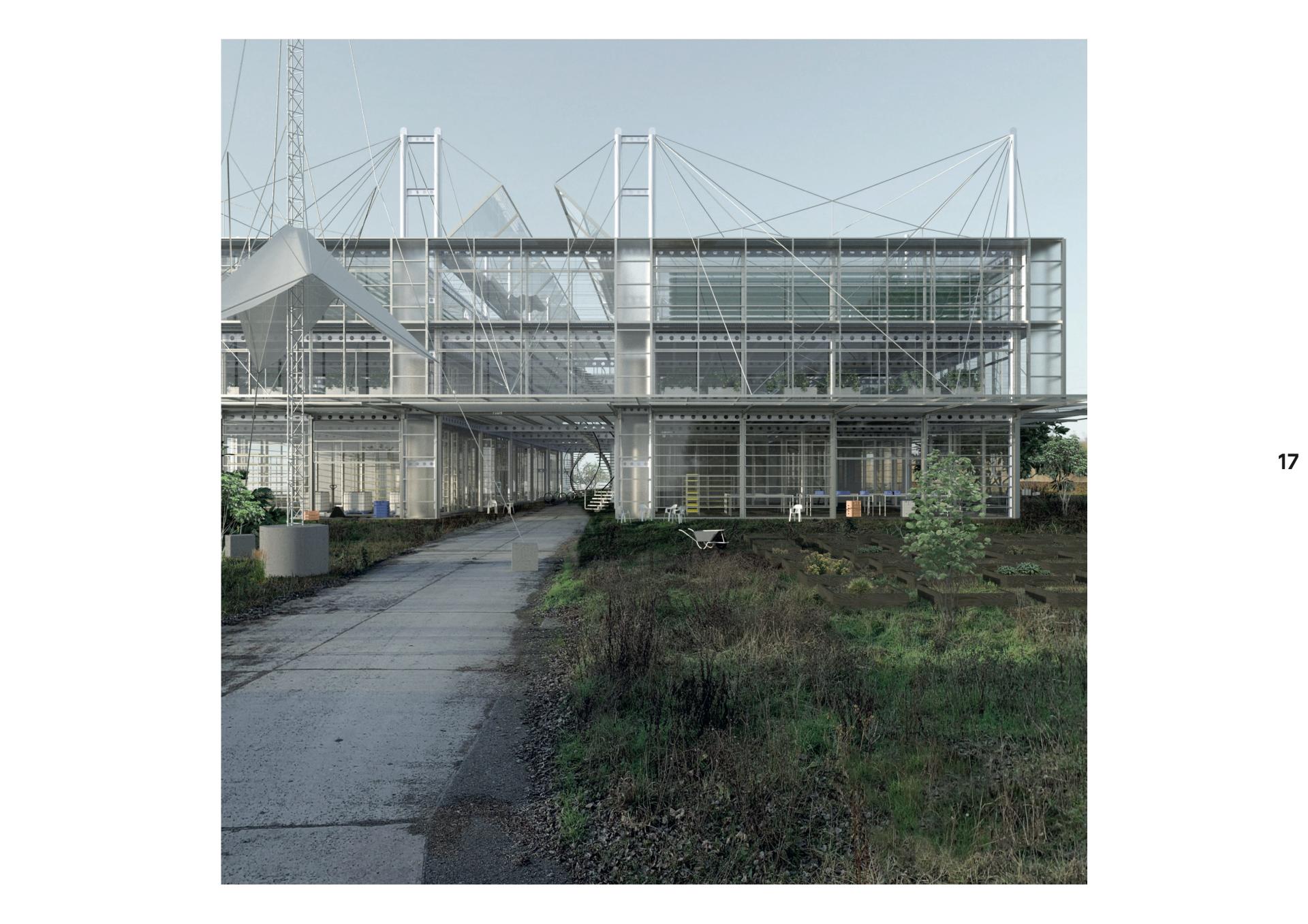 A new form of continuous spatial production, energy supply, food production, residing, working and living, research and renaturation will be proposed for a formerly industrially used site in Berlin Rummelsburg with the aim of initiating the development of a social and ecological life practice. According to the vegetation, different areas are defined, which describe the future relationship between man and nature and an appropriate treatment of soil and vegetation. Areas of renaturation where man takes deliberate targeted measures to support nature in the process of wildness, areas of cultivated nature, research beds that analyze and evaluate the cultivation of plants under different conditions, and areas where contaminated soils are detoxified and renaturated through remediation measures. Existing tanks, originally used as water reservoirs, are being converted into the site's energy center. Through solar cells, biogas plants operated in cooperation with the municipal waste disposal, a combined heat and power plant and water tanks, a decentralized energy supply model is proposed that will make the surrounding area mostly independent of large energy suppliers. The Bioshelter, a residential building for about 200 people, proposes a productive, climate-active form of housing in which human and natural habitats overlap. The algae farm interconnects production cycles of aquaponics, algae production, and a server farm in a way that allows for resource-efficient year-round production. The Movement House transforms an existing industrial building into an infrastructure that stimulates and enables formal and informal movement among residents. The research station collects data on the state of the ecosystem, analyzes, evaluates, experiments, tries and maintains. The residents of the area become gardeners of their shared livelihood - people are involved in multiple ways in the processes that contribute to the preservation of the constructed ecosystem.