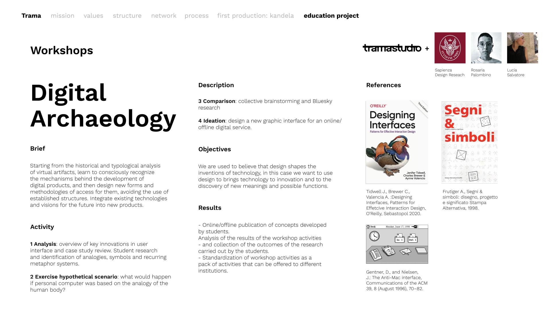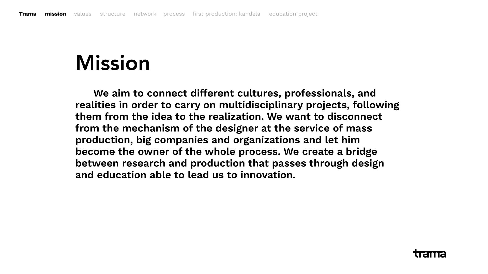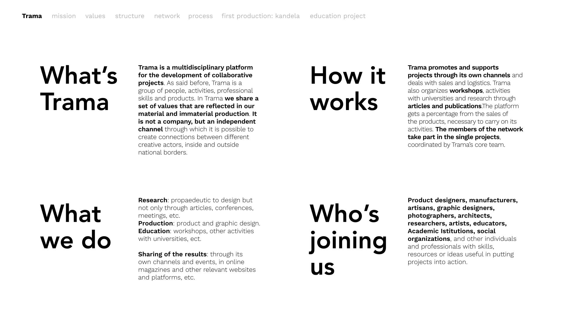 Trama is primarily a community of people that bases its actions, open not only to professionals but also to students with educational activities, on confrontation and discussion and, at the same time, seeks also to involve the final users of its products in the same process.