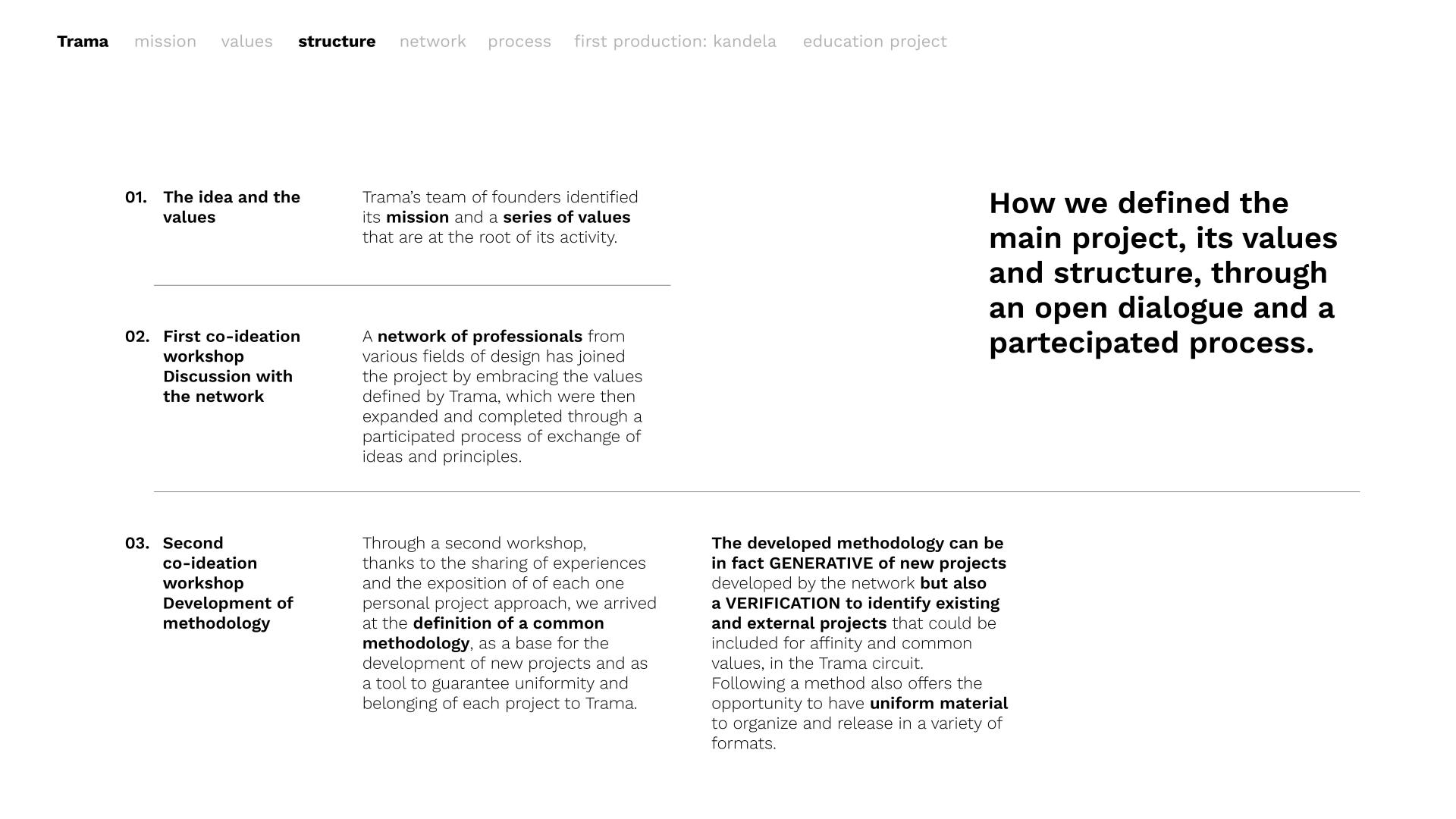 The values and mission identified by Trama's team of founders were expanded and completed through a participated process of exchange of ideas and principles along with the first network of partners. thanks to the sharing of experiences and the exposition of of each one personal project approach during a series of co-ideation workshops, we arrived at the definition of a common methodology, as a base for the development of new projects and as a tool to guarantee uniformity and belonging of each project to Trama.