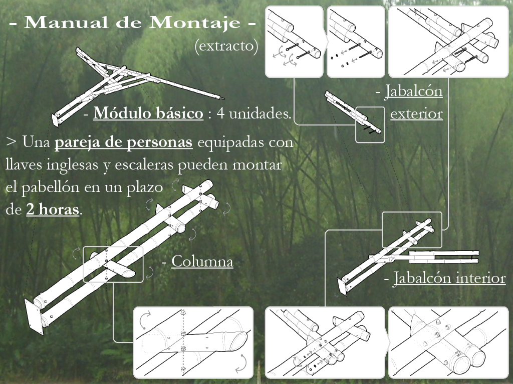 The concept of prefabrication applied to bamboo makes it possible to build with structural round pole bamboo anywhere in the world, even in those places where there is no tradition or practical knowledge on how to use this material in construction. This also allows the system to be built and dismantled as many times as desired, while benefiting from low-cost shipping to any destination. All the pieces in the system are arranged in boxes of less than 50 kg each, so two workers can carry the boxes one by one. A basic module (covering 7 by 7 m), when dismantled, is package in a total of 7 boxes, 3 m (either horizontally or vertically), by 1 m, by 1 m, and weights a total of 250 kg.