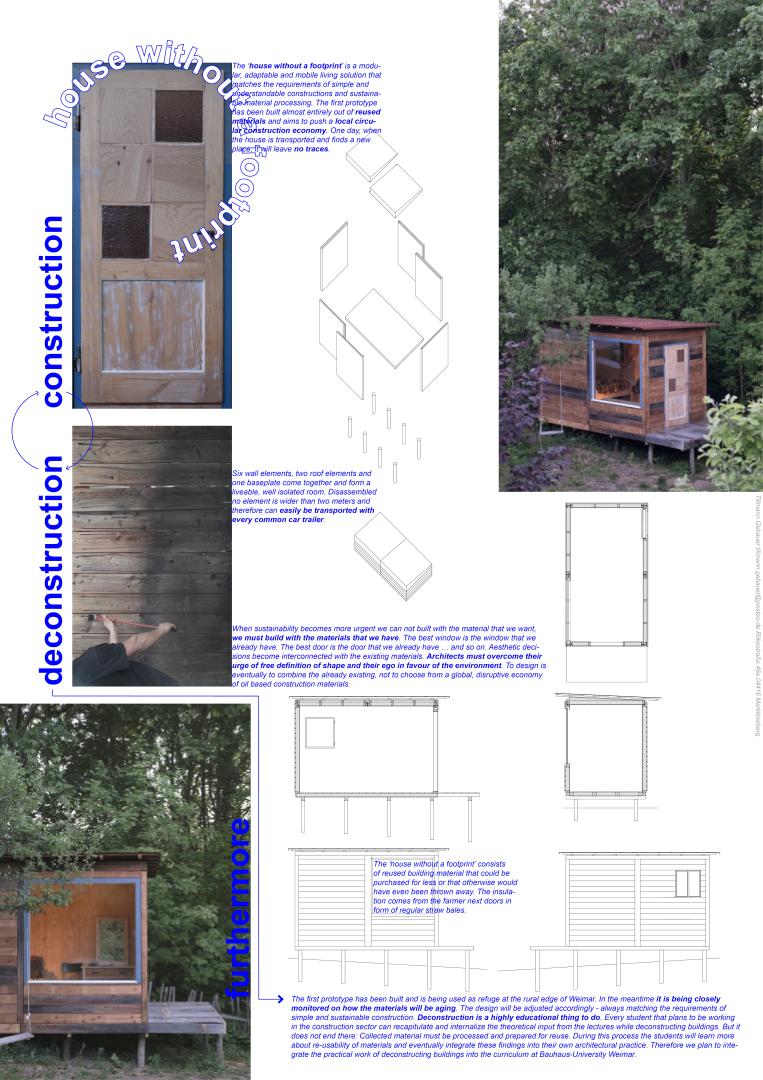 The 'house without a footprint' consists of reused building material that could be purchased for less or that otherwise would have even been thrown away. The insulation comes from the farmer next doors in form of regular straw bales. Because the rural soil is affected heavily by erosion and sealing the house stands on partly buried piles that lift it 30 centimetres of the ground and consequently protects the soil underneath it. This foundation is easy to install and can be done by everybody. One day, when the house is transported and finds a new place, it will leave no traces. Like the name says it has no footprint whatsoever.