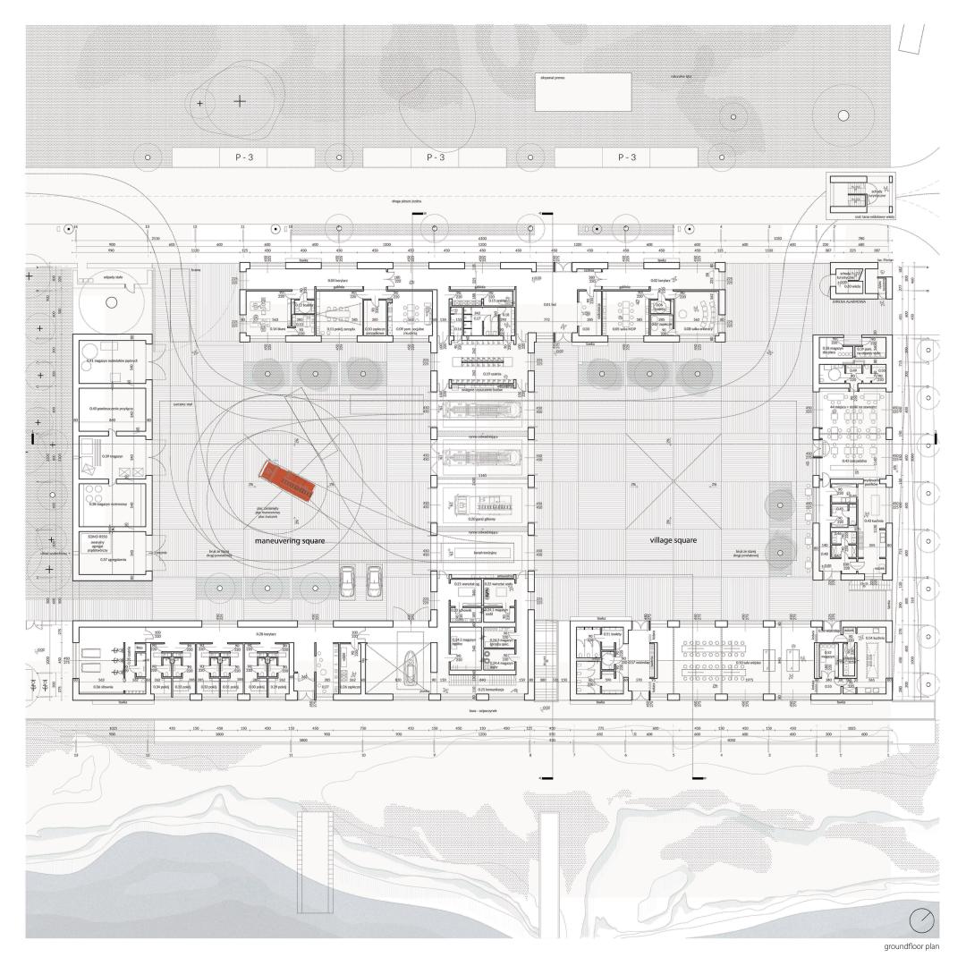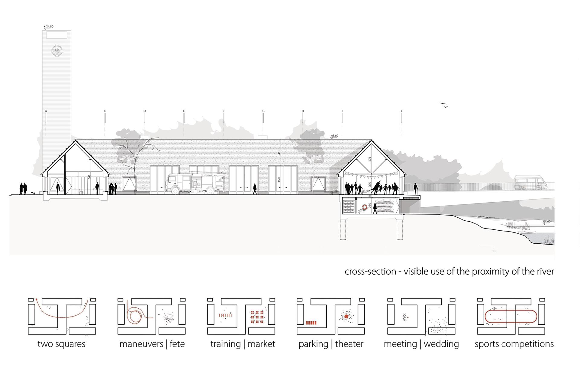 Formally, the architecture continues the rural character of the place by using double-pitched roofs with a slope of 45 degrees and a height similar to that of the neighboring buildings. The plan of fire stations itself is based on the farm plan. The square, made up of buildings with a social function, becomes a necessary rural market. A place where markets, country theater, or harvest festivals are organized. The selected proportions and greenery allow for the creation of a space that is pleasant for people.