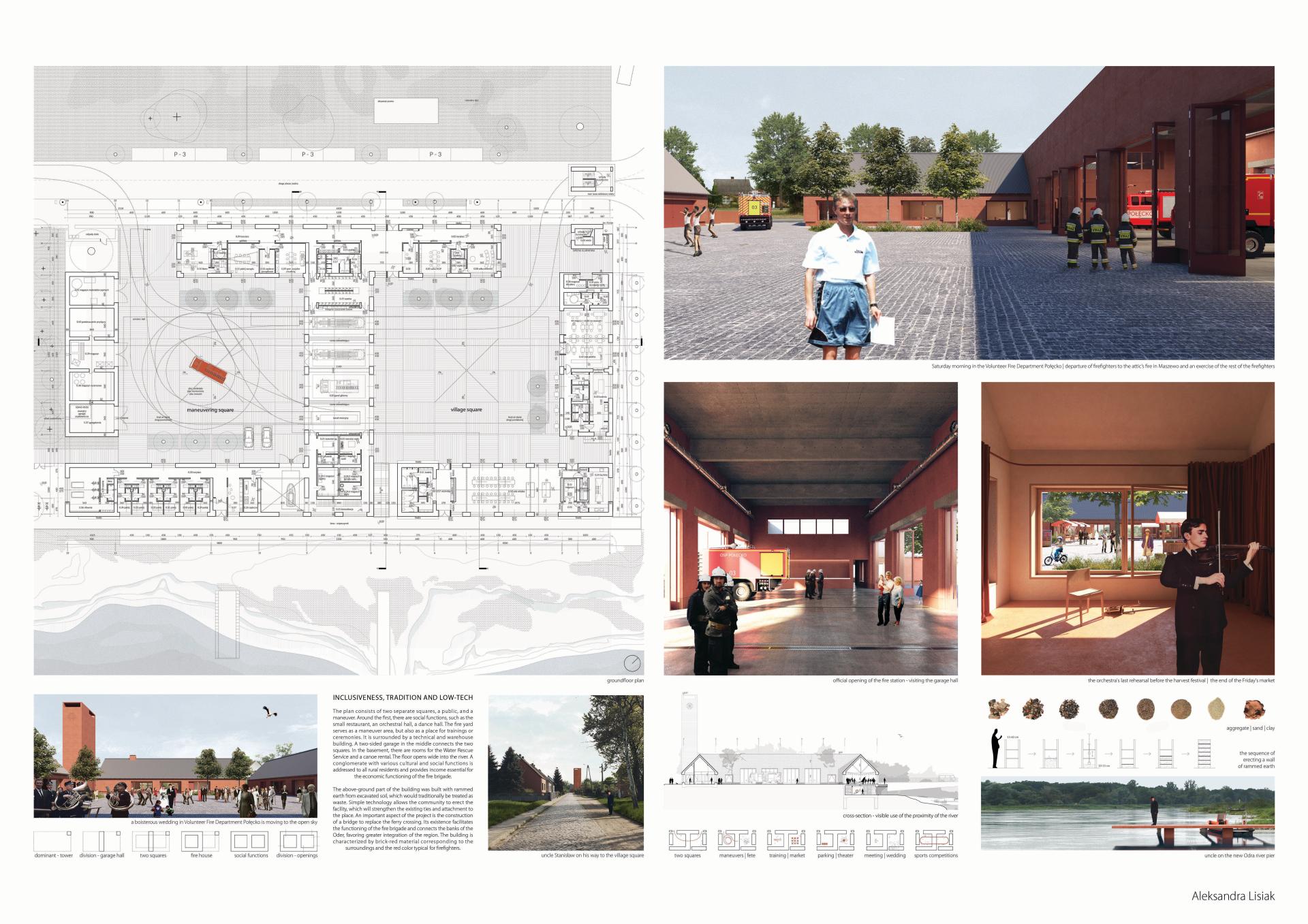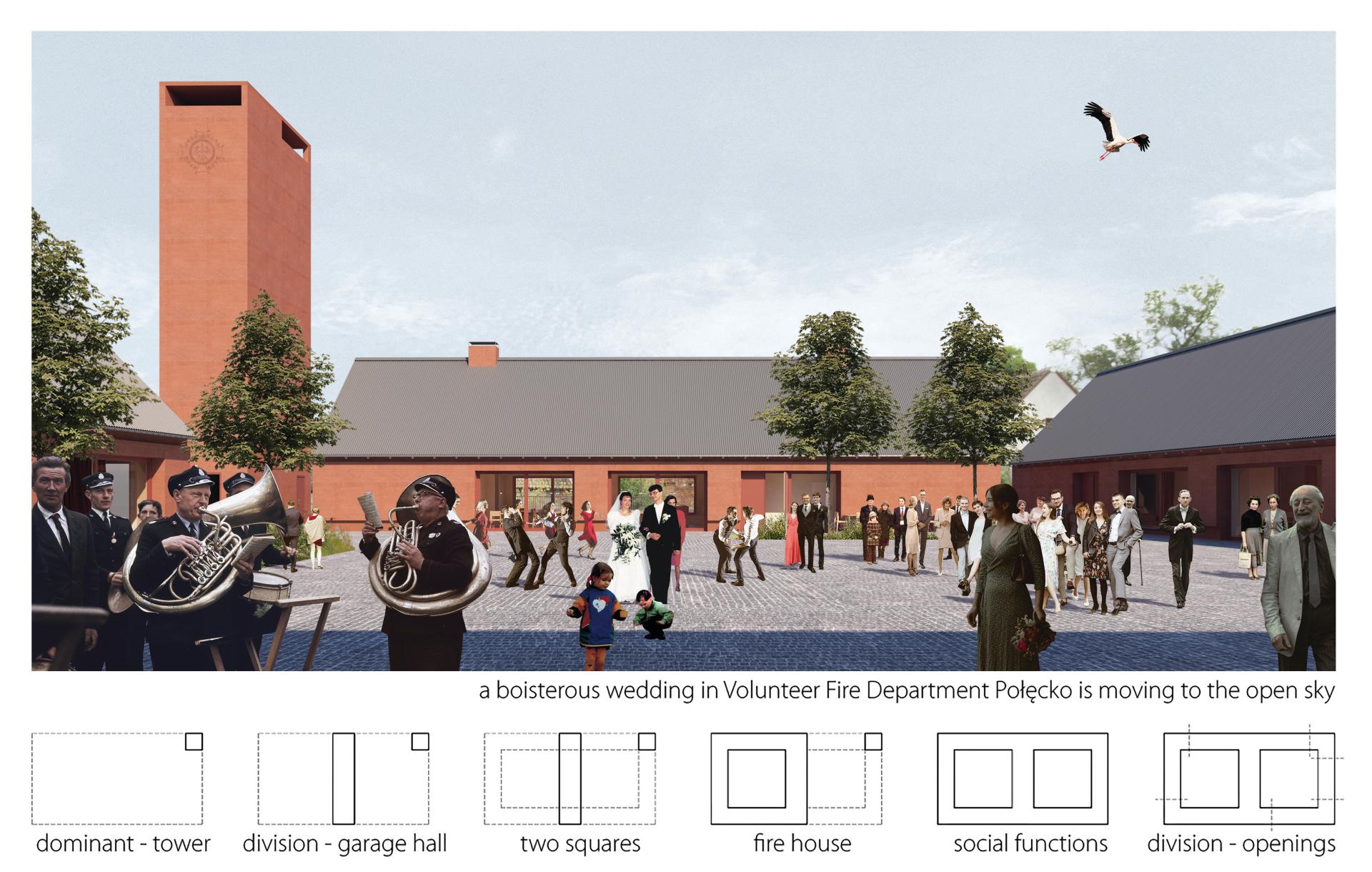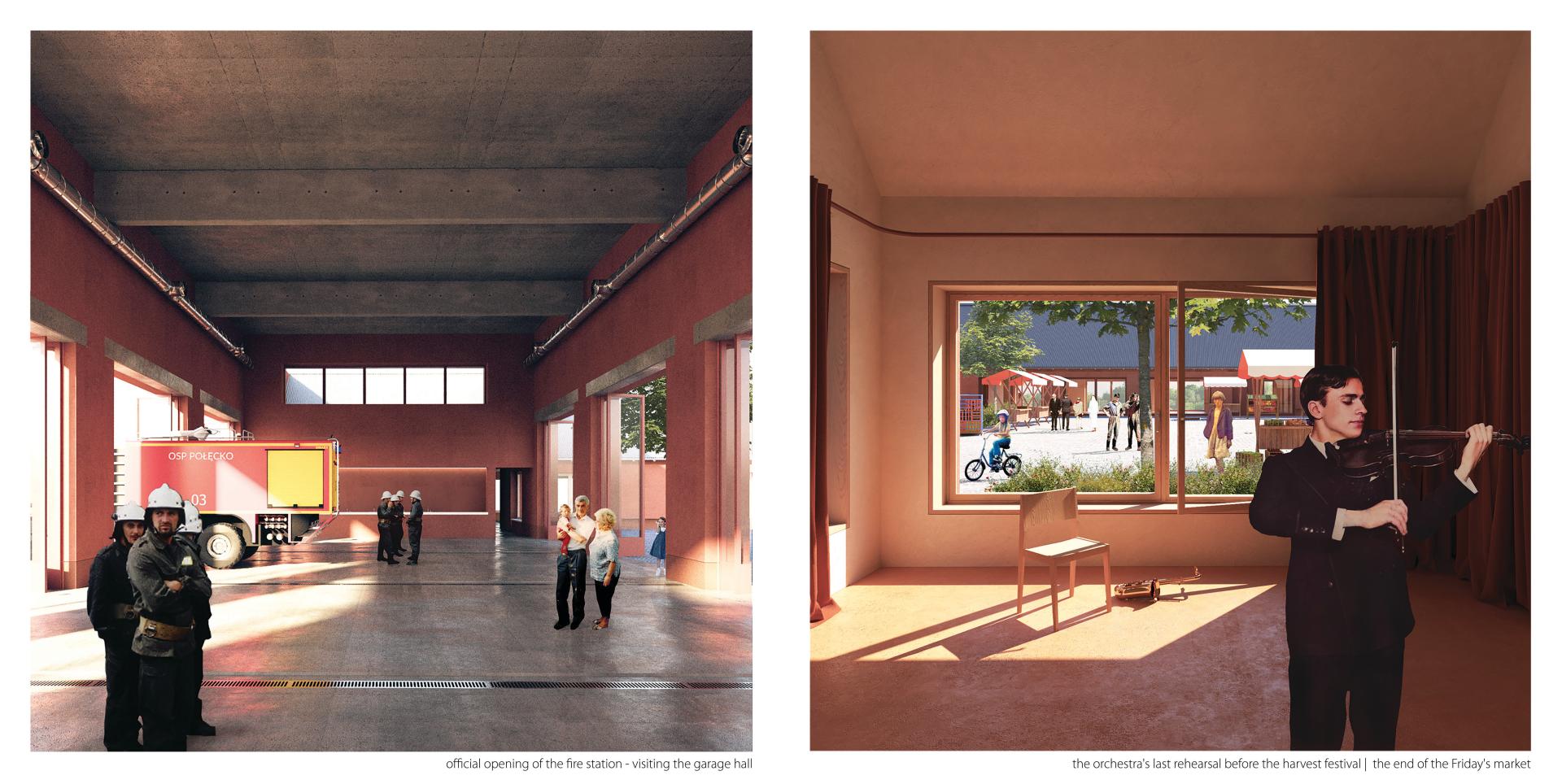 Poland is one of the most rural countries in the EU - 93% of the country is classified as a countryside area. These areas suffer from many problems, the most severe of which is climate change, incl. drought increasing the strength of fires. The firehouse is inextricably linked with the theme of the Polish countryside. Inclusiveness, combined with the continuity of the Voluntary Fire Departure existence, makes it firmly rooted in social consciousness. The network of fire stations shows its phenomenon and potential. The designed firehouse has a chance to become a catalyst for positive changes by expanding the cultural and social offer of the village inscribed in the traditional triangle of dependence: church - fire station - mayor.