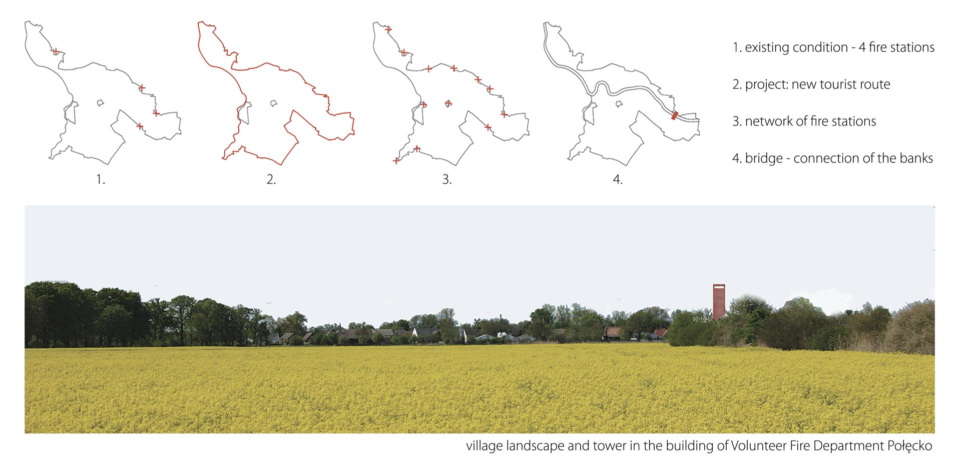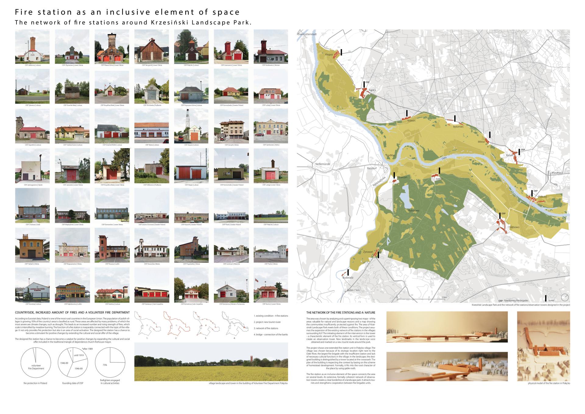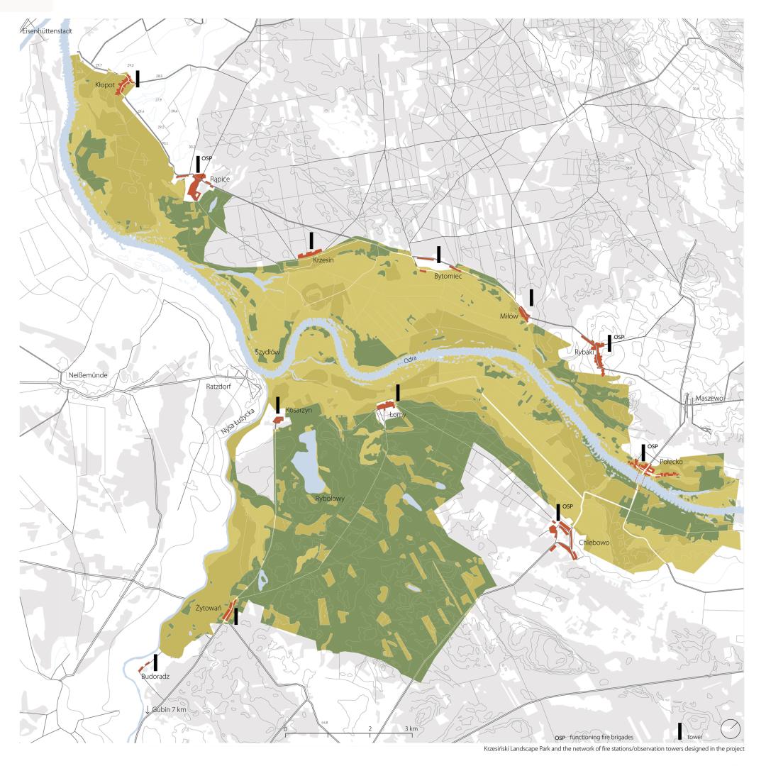 The location was chosen by overlapping two maps: municipalities insufficiently protected from fire and areas valuable for nature. The project involves the network of fire stations in the villages surrounding Krzesiński Landscape Park, creating a clear border and a new tourist path. The first intervention is rising watchtowers.