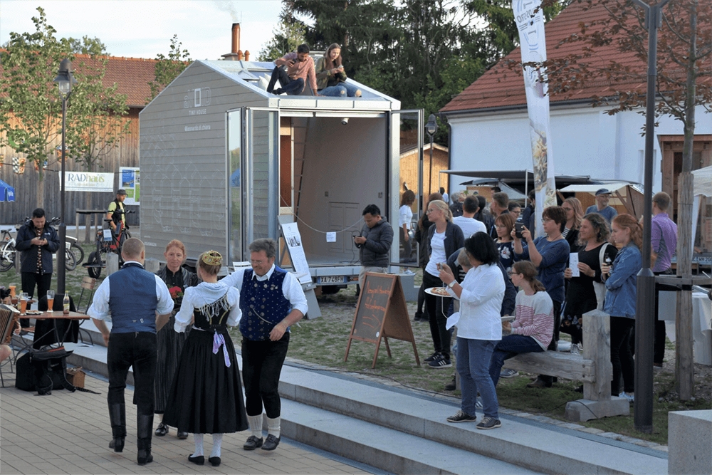 Aesthetics and a unique “edutainment” experience with maker spirit are instrumental for our purpose of social innovation. The four core elements are brand, location, content and people, always balancing rural heritage and innovation. The consistent brand identity of the Silicon Vilstal initiative combines authentic rural visuals and minimalistic design. Posters, communication materials, motto shirts, online channels etc. all use this brand. Our Festival has a different motto and corresponding key visual each year, starting with “MOO” in 2019, followed by “Future@home” in 2020 and “Social Game” in 2021. Secondly, we curate and shape the locations, playing with heritage and modern elements. E.g., we organized a tiny house pop-up village at our festival campus at the historical Bavarian Centre for Traditional Costumes, with tiny houses on wheels from across Europe. We used old barns for upcycling artworks exhibitions and village inns for design lectures etc. The edutainment content of our festival offers participatory design workshops on furniture (e.g. from Enzo Mari, Social furniture by EOOS), products, rural mobility and architecture (e.g. onsite prototyping of vacant buildings as fashion stores or innovation labs). Creative methods like design thinking or graphic recording are teached to the visitors. Pop-up Makerspaces leverage the existing facilities and production resources of local enterprises, we offer creative STEM workshops with robotics, metalwork, 3D printing, laser cutting etc. Finally, the unique interdisciplinary blend of people is a core part of the “Silicon Vilstal experience”. People from our rural area (partly in traditional costumes), urban designers, digital experts, traditional musicians, digital startups, international guests e.g. from Europe, Africa or Asia, they all mingle in a special rural-creative atmosphere. In particular, the festival is an event for & with startups, that participate in our founders programme “Farmer seek startup”.