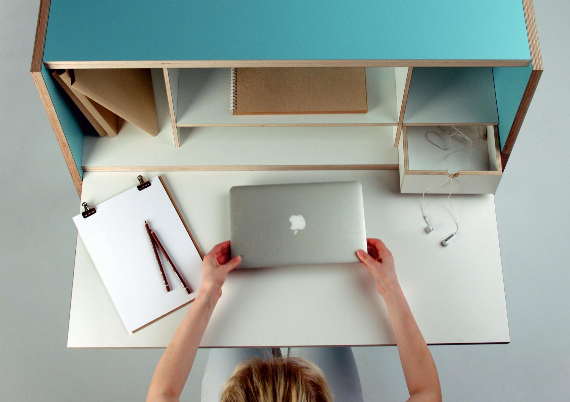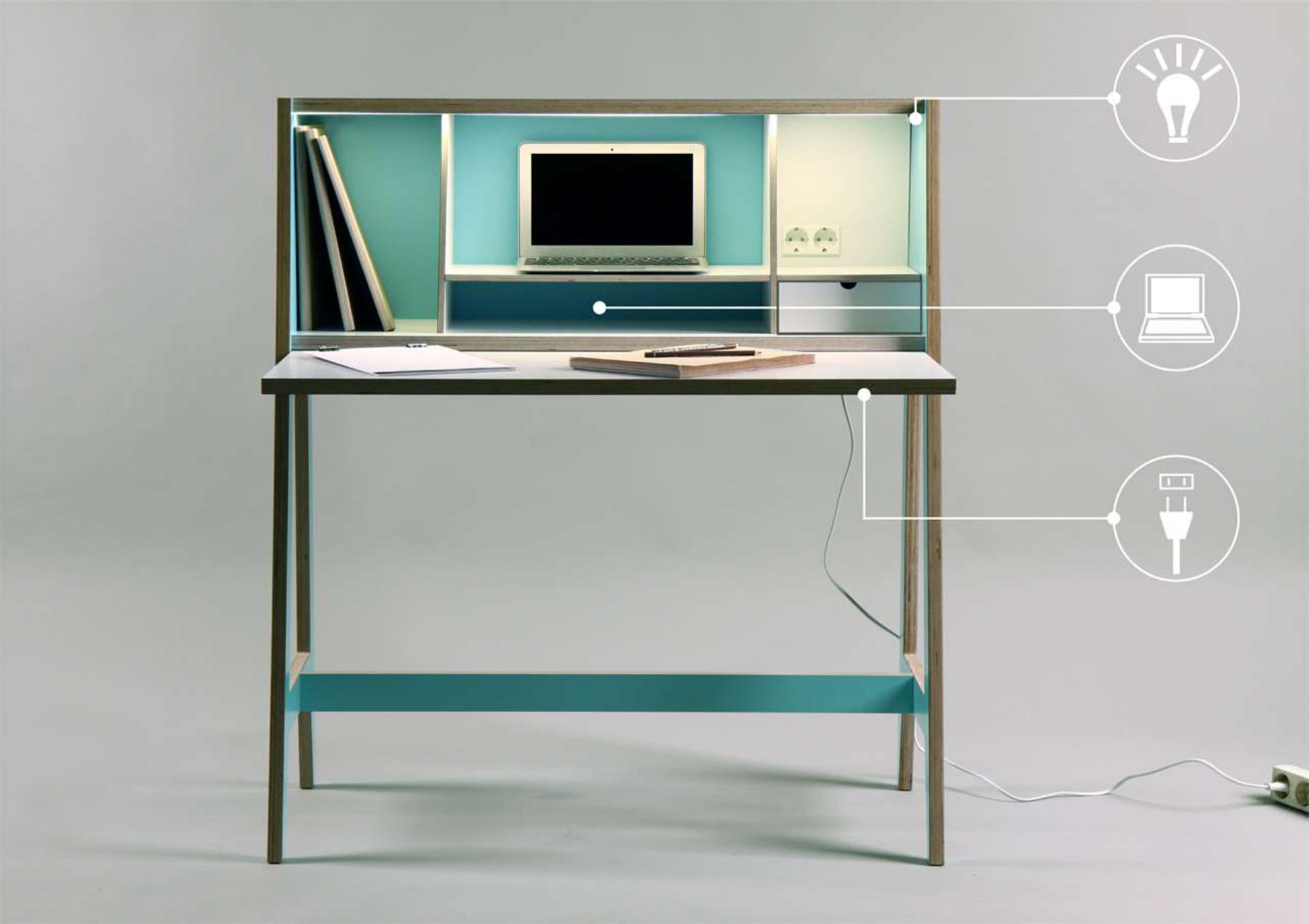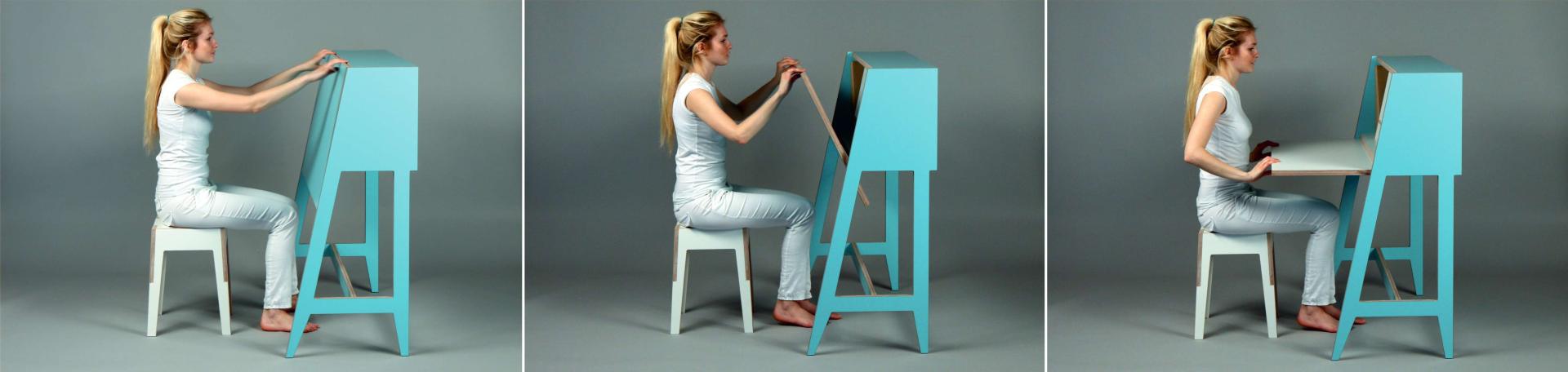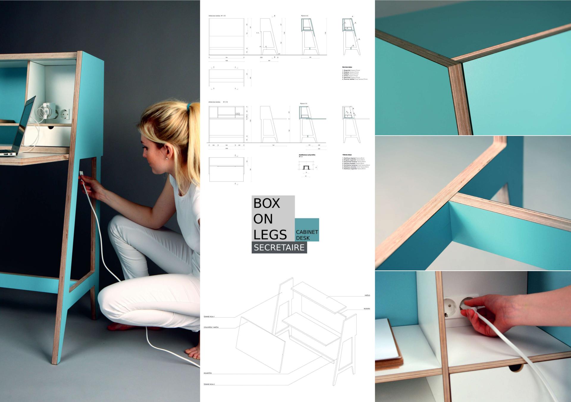 “Cabinet-desk” - assembled furniture created in such a manner that it could be easily stored and transported. The storage of the furniture is facilitated by assembled leaf construction, which is made from especially firm material- humidity-proof furniture plywood, laminated with high-pressure laminate (hpl). An assemblable dry knot/hinge is used, which does not require a lot of time when assembling the furniture. The furniture also has an integrated light source - deepened LED profile and outlets.