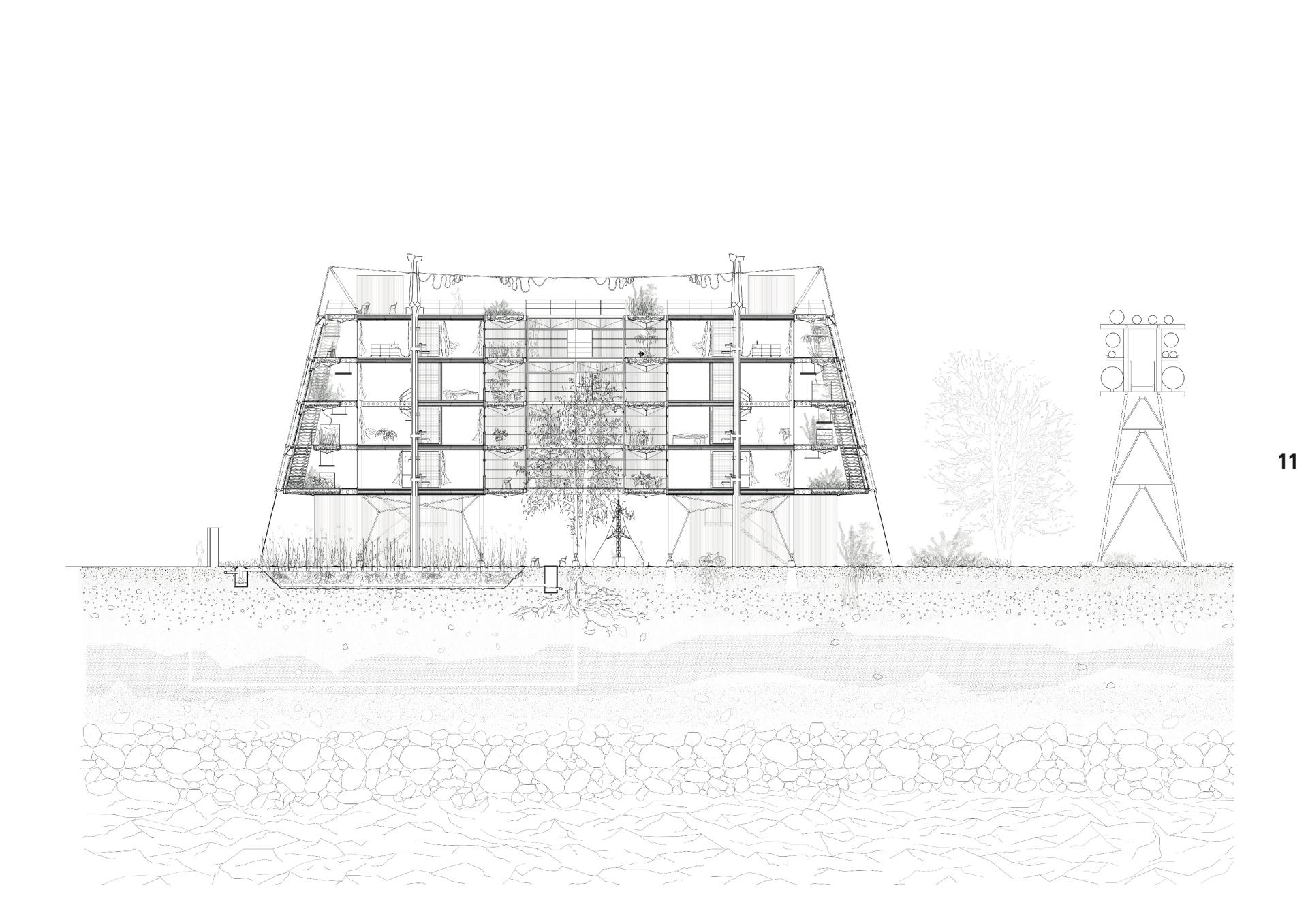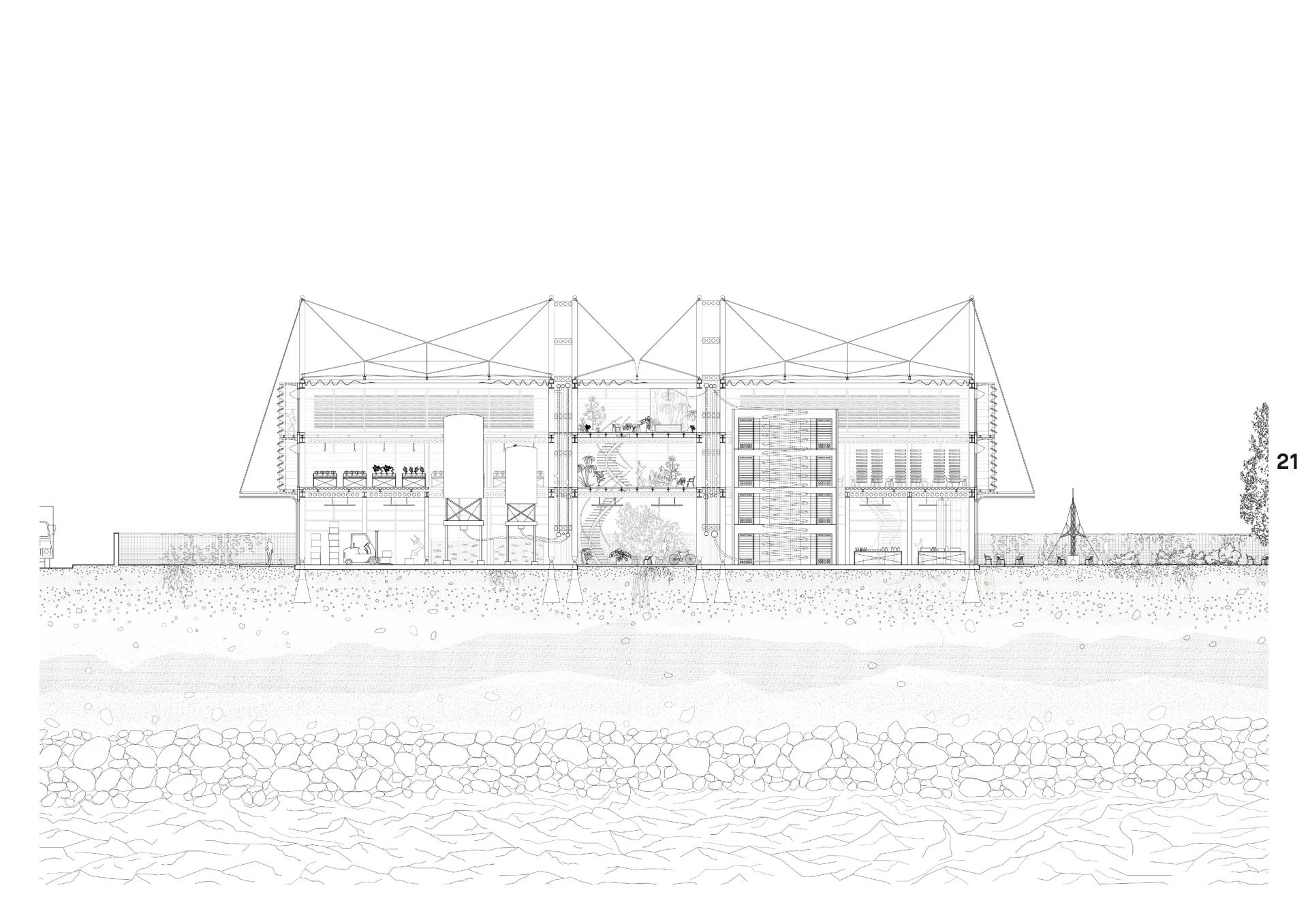 A new form of continuous spatial production, energy supply, food production, residing, working and living, research and renaturation will be proposed for a formerly industrially used site in Berlin Rummelsburg with the aim of initiating the development of a social and ecological life practice. According to the vegetation, different areas are defined, which describe the future relationship between man and nature and an appropriate treatment of soil and vegetation. Areas of renaturation where man takes deliberate targeted measures to support nature in the process of wildness, areas of cultivated nature, research beds that analyze and evaluate the cultivation of plants under different conditions, and areas where contaminated soils are detoxified and renaturated through remediation measures. Existing tanks, originally used as water reservoirs, are being converted into the site's energy center. Through solar cells, biogas plants operated in cooperation with the municipal waste disposal, a combined heat and power plant and water tanks, a decentralized energy supply model is proposed that will make the surrounding area mostly independent of large energy suppliers. The Bioshelter, a residential building for about 200 people, proposes a productive, climate-active form of housing in which human and natural habitats overlap. The algae farm interconnects production cycles of aquaponics, algae production, and a server farm in a way that allows for resource-efficient year-round production. The Movement House transforms an existing industrial building into an infrastructure that stimulates and enables formal and informal movement among residents. The research station collects data on the state of the ecosystem, analyzes, evaluates, experiments, tries and maintains. The residents of the area become gardeners of their shared livelihood - people are involved in multiple ways in the processes that contribute to the preservation of the constructed ecosystem.