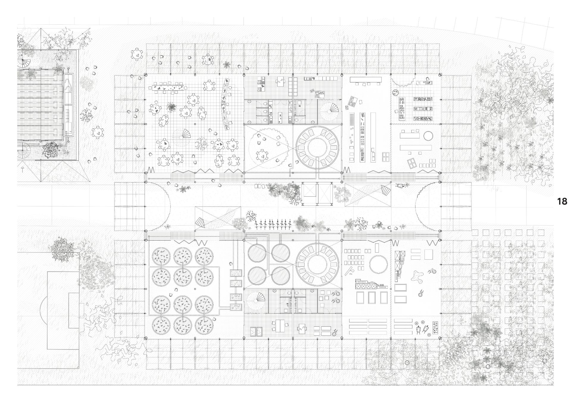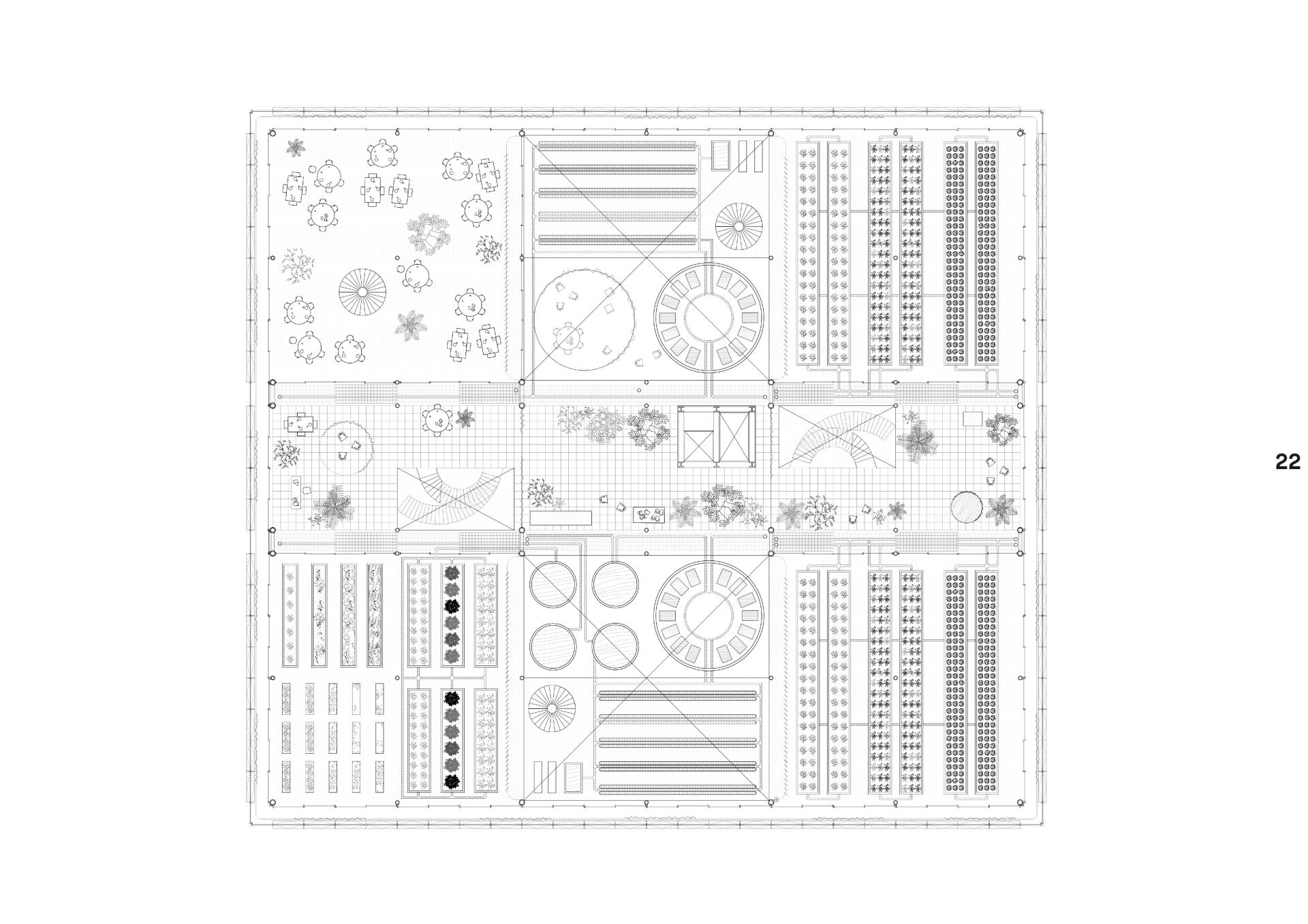 To avoid a catalogue of defined aesthetical criteria, the focus of the project lies in the democratic inclusion of all. In the mostly vague situations on the plot lies an adaptable potential for all actors. There are spaces in between, like the wintergardens of the bioshelter or the circulation space of the Movement House, of different sizes, allowing for changing and establishing social and spatial structures of learning and communication to form its surroundings. They’re all part of a public process and can’t be defined by an individual. In addition to the inclusion of all stakeholders into the process of evaluation, shaping and designing of the environment, the project proposes a new semantic recodification of elements. By communicating our thoughts through design, we are able to restructure traditional elements and aesthetics of living, producing and working.