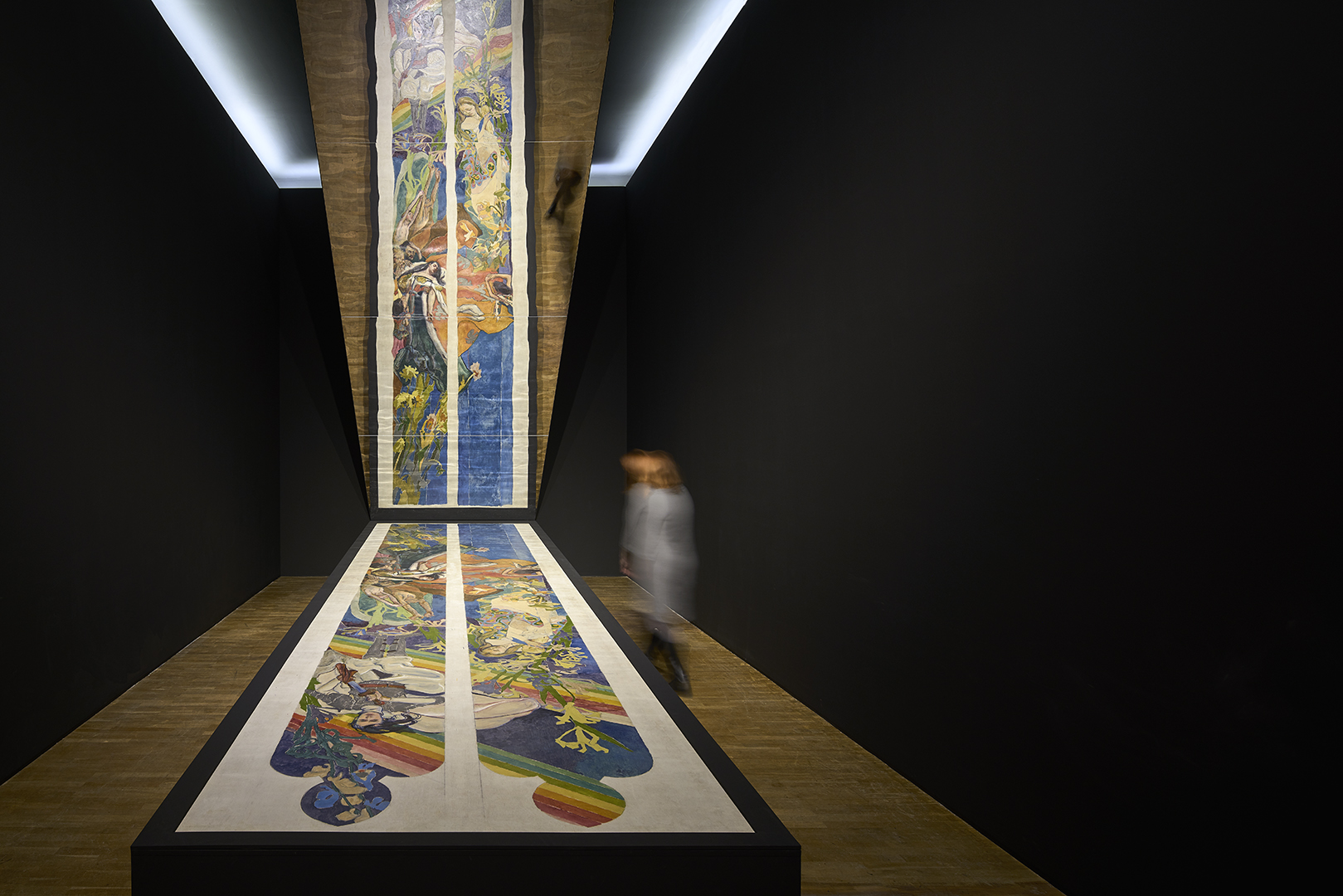 Important aspect we have devoted much attention to were varied ways of perceiving Wyspiański's works. We wanted the viewer to see them in the same way as the artist once did. Hence, the decision to place stained glass designs for the Franciscan church in Krakow on the pedestals in one of the first exhibition rooms. This composition of seven horizontally arranged works of art could also be viewed from an elevated platform. In the other of the two spaces with the common name “Polychromes of Franciscan Church” on display was not only the final result of Wyspiański’s work, but also the whole creative process. In the display cabinets on the ground floor and the mezzanine one could see pounced drawings – templates, which, thanks to indirect lighting, showed the mysterious composition of crosswise hand-crushed tracing patterns. On the main wall of this room there was also a monumental mosaic composed of several dozen polychrome sketches for the Franciscan church. It could be seen from two different levels, including the mezzanine additionally equipped with magnifying glass, which allowed you to explore the details of multi-colored pastels. As part of this impressive collage of 15.0 x 5.0 m in total, historic paintings created a surprisingly contemporary composition. In the next rooms there were further characteristic features of the exhibition – the so-called “chapels”. These were three free-standing cuboids for the exhibition of large-format works, which Wyspiański made for churches in Krakow and in Lviv. Unfortunately, most of them have not been implemented at their destination, so we have tried to design contemporary spaces dedicated to these works. These three “chapels” were an illustration of the desire to interpret the idea of the sacred in architecture, at the same time being unique examples of interiors designed exclusively for the exposition of individual works of art.