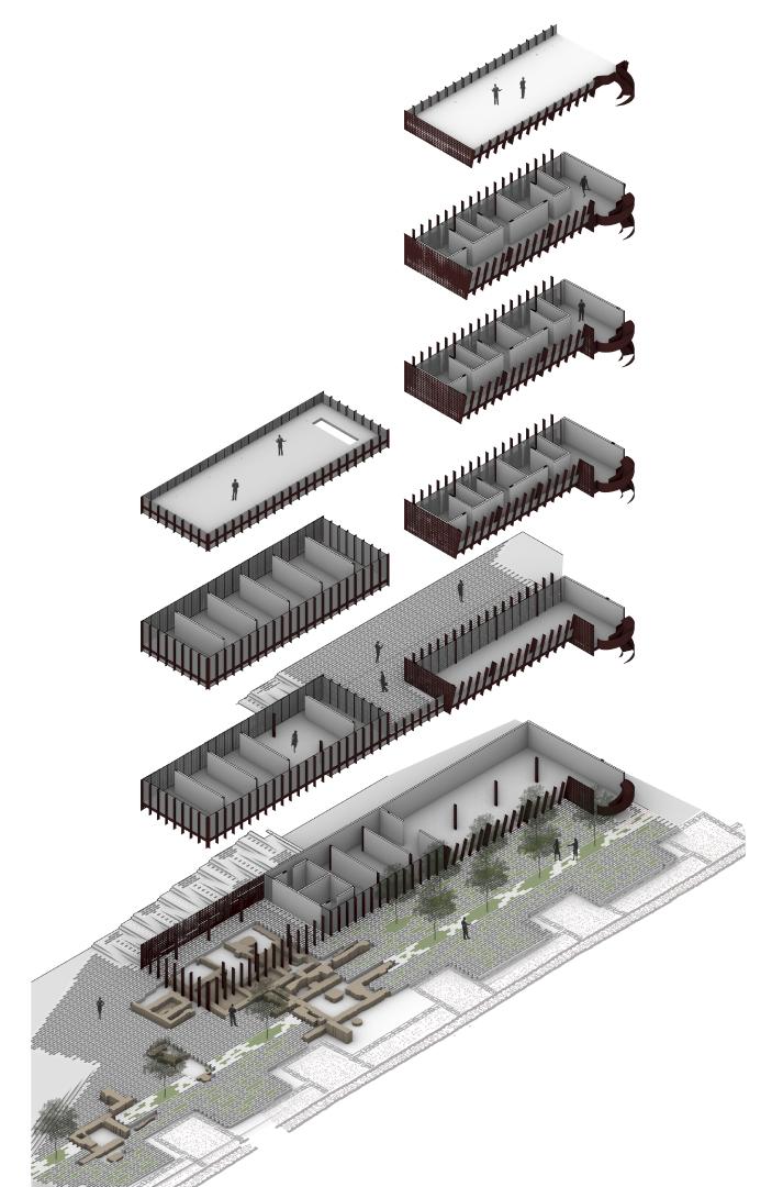 The flagship material of the project is corten steel since its aged tone unifies the building with the Roman ruins and the wall. The other materials used will be softer like concrete or glass. Between the building and the wall, a plaza will be created at level -1 of the building, which will be level with the Roman ruins. This square will not only be connected by the building, but it will also be accessible by the street, which will go down through stairs and ramps. This project not only aims to renovate an area that has been neglected but also aims to create a meeting and living point in the centre of the city, within the reach of all citizens.