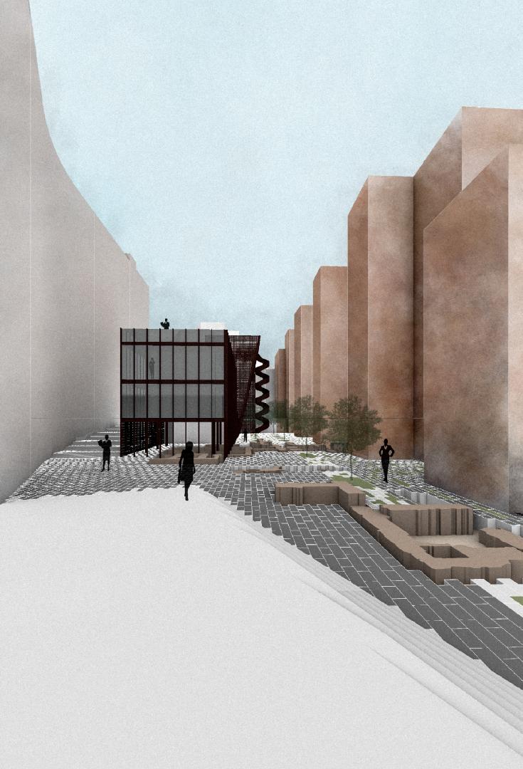 This project is based on revitalizing the historic area of ​Barcelona, ​in such a way that the project focuses on the Roman wall that is being recovered and the surrounding Roman ruins, which complement the project itself. The facade made of glass thus reflects the wall, creating an infinite space in the square. On the other hand, the Roman ruins enter the building thus unifying the two spaces. The façade facing the street is more compact, creating a perforated façade with a geometry that resembles the irregularity of the bricks of the wall due to the passage of time. The tallest building, which houses the apartments of the co-housing, has a sloping façade, which aims to leave the entrance of light on the ground floor, have more public space and gain space on the upper floors. With this set of facades, the sloping façade and the generated patios are intended to attract pedestrians to the project and generate privacy for its residents while giving spectacular views of the wall. To access the unevenness where the Roman ruins are, a system of stairs with a ramp has been created, which allows pedestrians to enter the project without forcing them to enter the buildings. The pavement has been made playing with different shades of grey to mark different areas of the project.