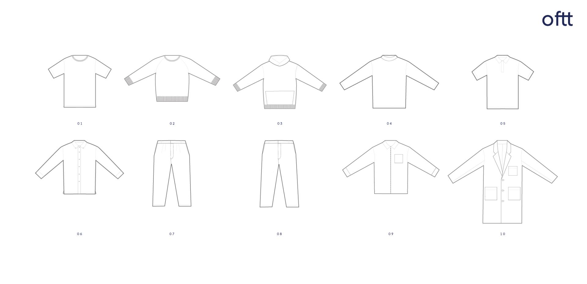 The oftt collection consists of 10 sustainable wardrobe staples, each category group has a number from 0-10 and includes; 01/ T-shirt 02/ Sweatshirt 03/ Hooded Sweatshirt 04/ Turtleneck 05/ Poloshirt 06/ Shirt 07/ Shorts 08/ Trousers 09/ Jackets 10/ Coats 00/ Accessories & footwear.