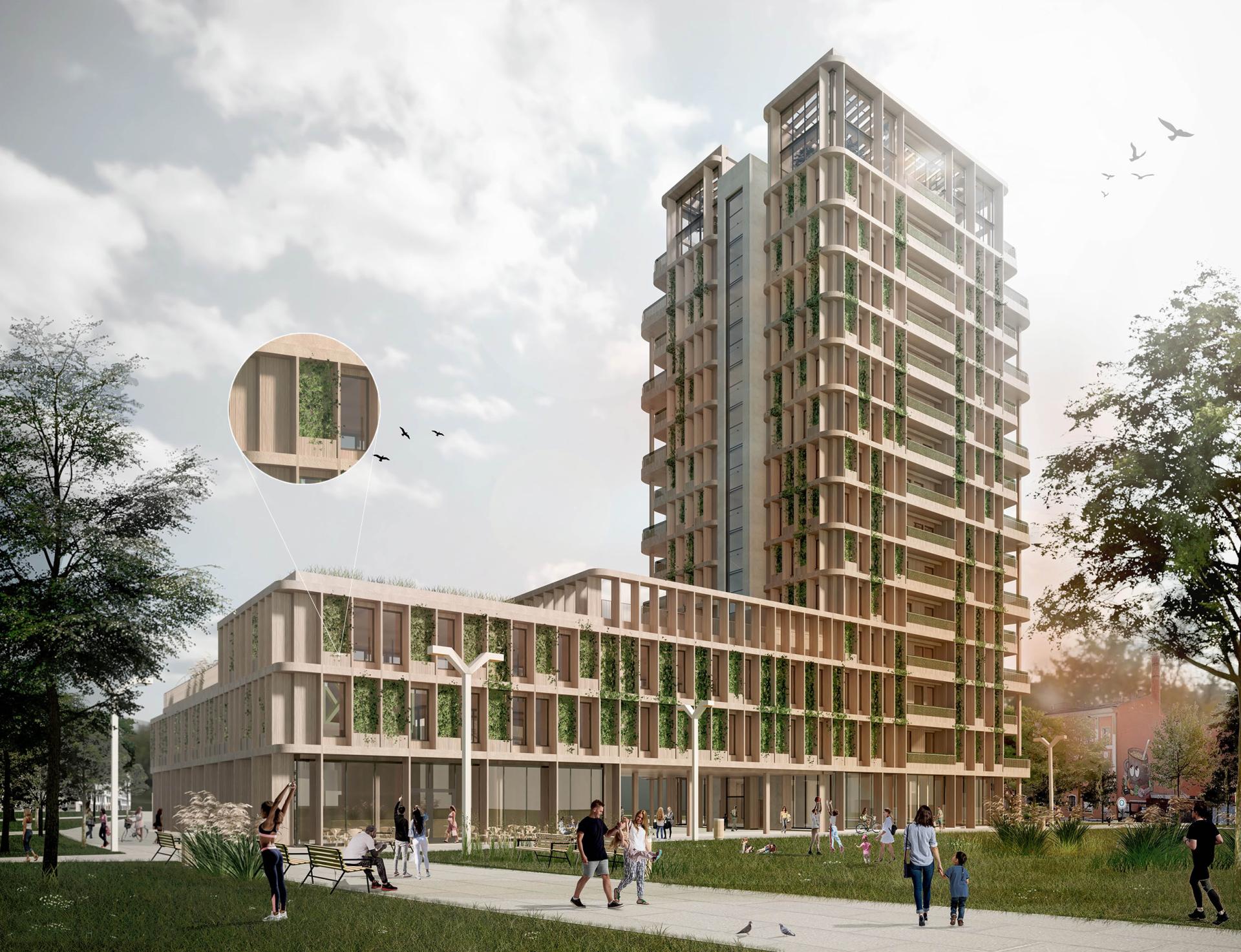The primary factors taken into consideration were an integration of people of every kind and regeneration of the site and its surrounding by respectful treatment of tradition of Viennese social housing programs. Introducing social housing development with a great diversification of public services could provide better quality of living in this specific area for every resident who would be interested in an active participation of taking care of shared space which is proposed to be transformed into a green park with a high priority of soft mobility. Replacement of the neglected greenery and miles of concrete roads with a wooden high-rise building covered with vertical greenery on facade proposing the best quality place to live surrounded by a green enclave full of flora and fauna could be a great change to improve the status of current developments around, generate new initiative or investments on the local ground and ensure the new place to live, work and evolve.
