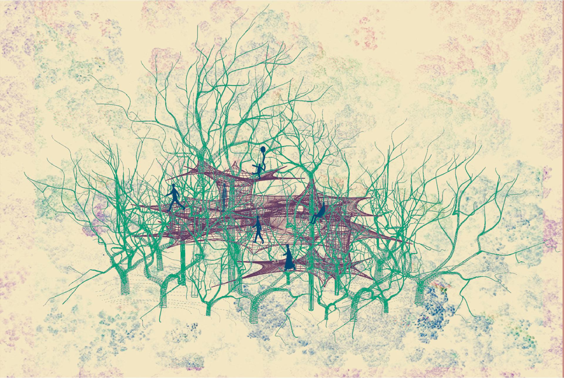 The project is based on speculative design, not located somewhere and adaptable everywhere. It is about creating a germ with the purpose to design a paradise. It's about dreaming, climbing trees, and generating architecture in the air.