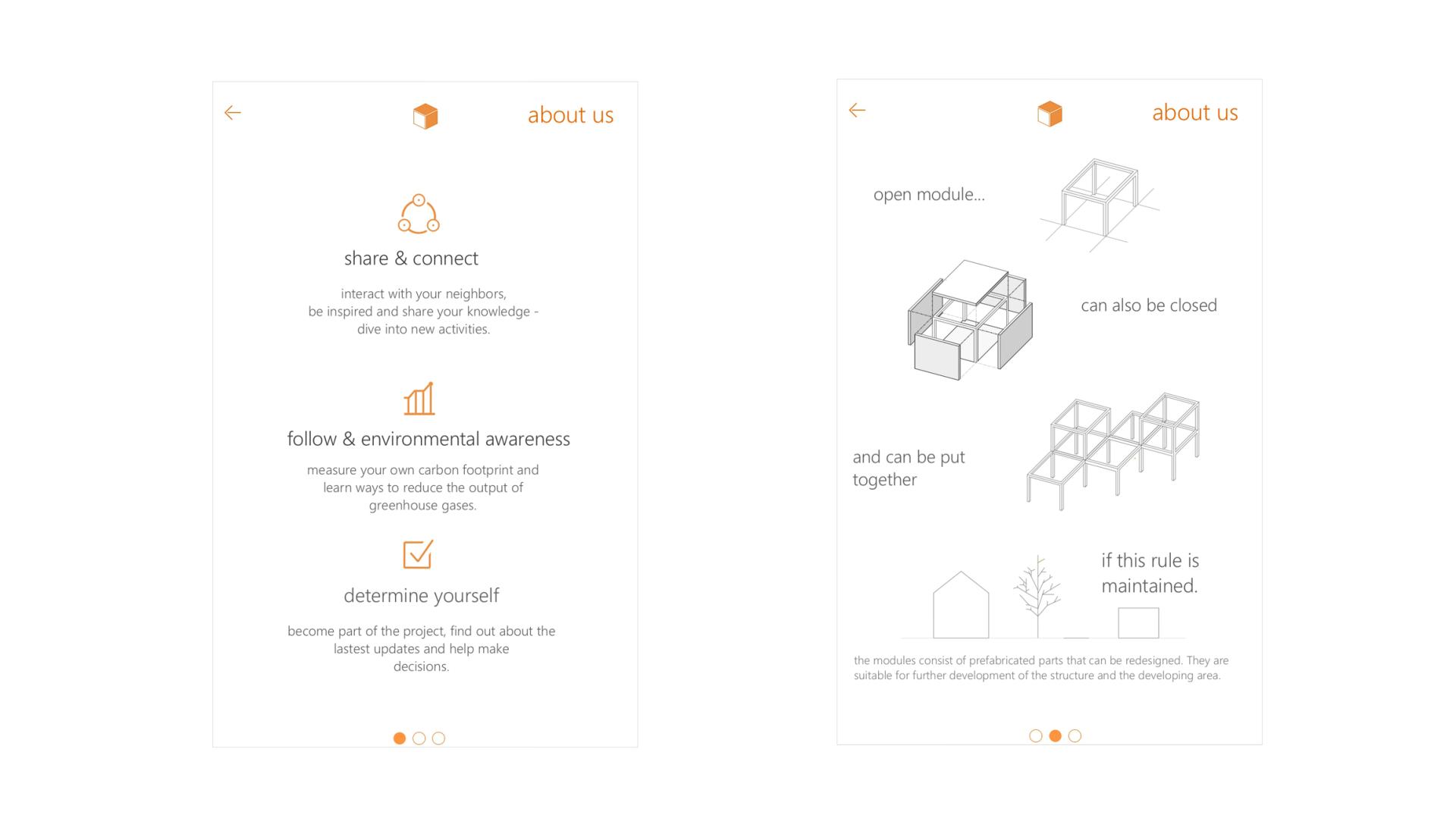 The app allows the citizens to gain environmental awareness by giving them the opportunity to track their daily consumption and activities, but also creates a community by enhancing the feeling of inclusion through letting them be a part of the development of their neighborhood. That way unnecessary building and its impacts are avoided.