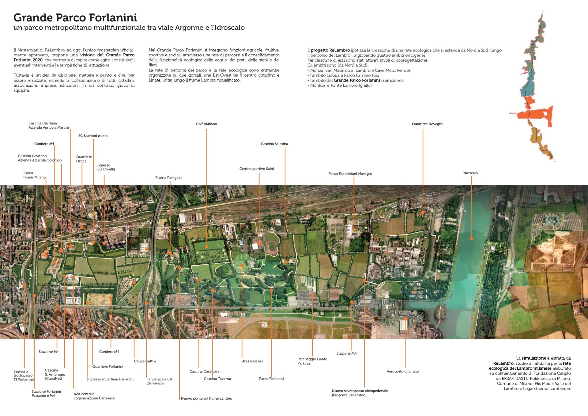 In 2012, however, the Parco Forlanini came back by the Re-Lambro Project, a project for the creation of the Lambro ecological network co-financed by Fondazione Cariplo and led by ERSAF, together with the Department of Architecture and Urban Studies of Politecnico di Milano, Municipality of Milan, PLIS Media Valle Lambro and Legambiente Lombardia. The so-called "ReLambro Masterplan" represented a trigger for the Parco Forlanini to become “Great”.