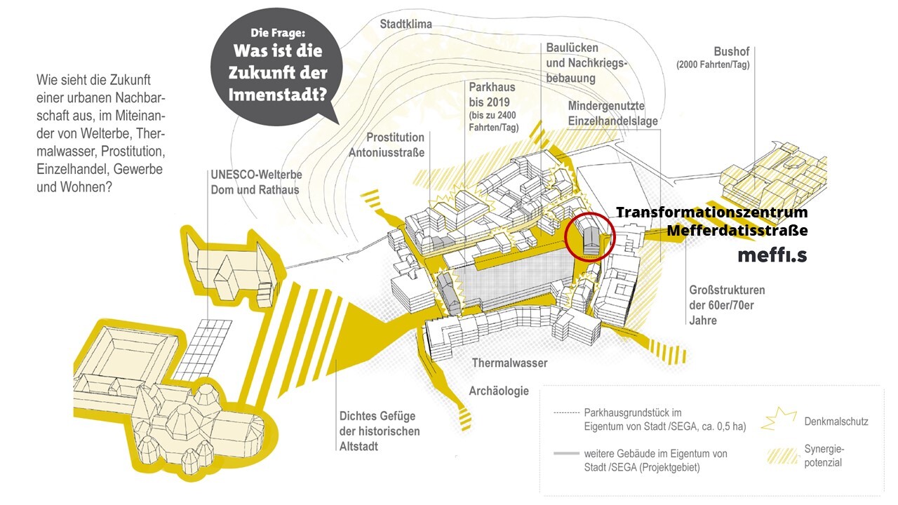 A coworking area, a makerspace including a studio and workshop, a café-bar, a cabaret stage and a new park area are being developed in vacant spaces in Aachen´s citycenter. The resulting hub is an open space for meeting, social engagement and creative development and aims to be part of a new regional ecosystem for social innovation. The development is driven by local initiatives in close cooperation with the city, the urban development company SEGA, the university and civil society organizations. The community of pioneers "Meffis" consists of more than 130 people who have been advancing the process in three development strands since February 2020: