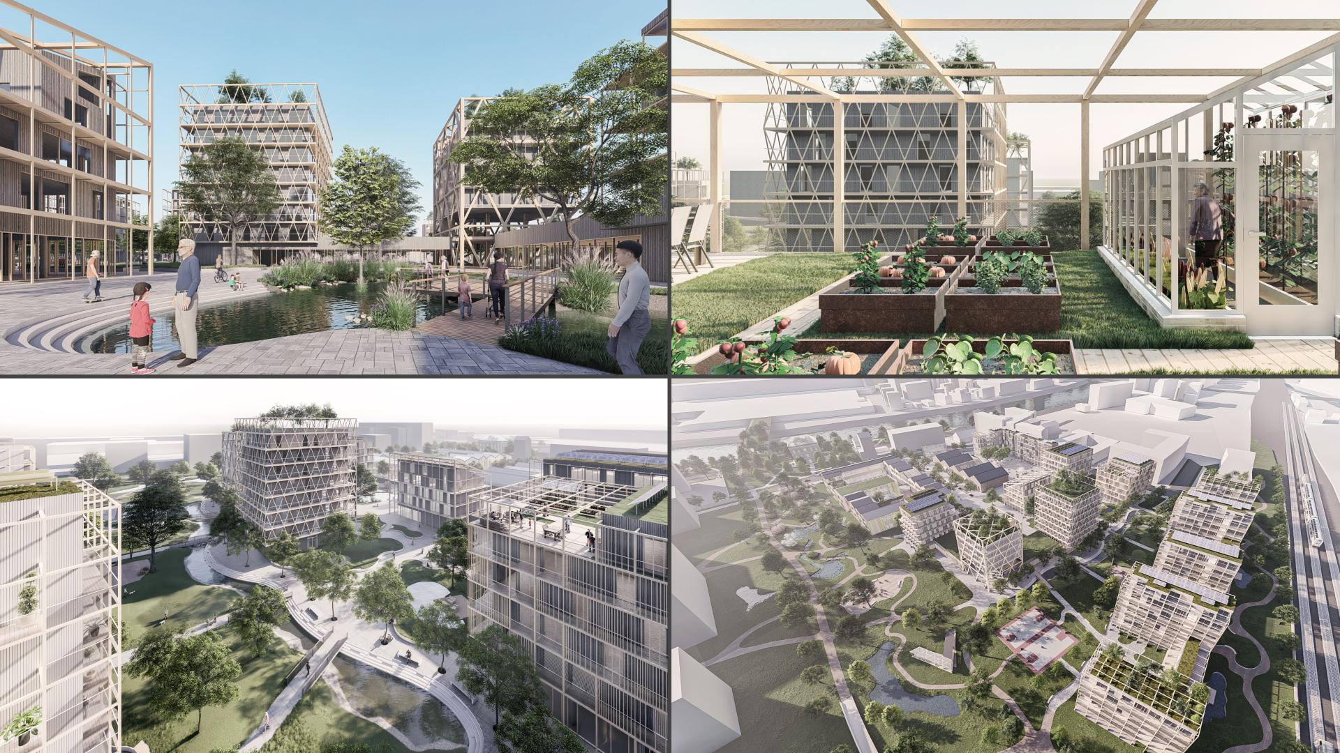 The basis is a proposal for the concept of green urbanism and a sociological study focused on the social interaction of the population. The aim is the synergy of industrial heritage and new architecture with regard to genius loci. We designed buildings with almost zero CO2 footprint, which are a combination of a wooden structure with a concrete first floor. We have breathed new variable and flexible use into industrial heritage sites. We used to open private objects to people with the possibility of constantly adapting the function. The city at short distances reduces the need of cars. We use natural and recycled materials from local companies. The load-bearing structures are optically recognized, concrete as a reference to history, CLT walls as a natural material. Our goal is prefabrication and dry construction process. The excavated land is reused on the site. Gray water recycling saved 40% of clean water. Rainwater accumulates on green roofs and outdoor areas and cools the microclimate in the city. Renewable energy sources generate all the necessary energy. The roof landscape consists of community and growing green roofs. Saddle roofs are made of integrated PV panels. Assessment od daylight and overheating create a quality indoor environment. The electricity produced is used directly in the building or accumulated in the battery. Energy is shared through a smart grid between objects with different daily peaks. Our goal is self-sufficiency and efficient use of energy. The result of the design are buildings with extremely low energy needs for heating. As part of the life cycle of buildings, we also considered the subsequent ecological recycling of new buildings. The architecture fully works with the proposed greenery, which consists of local greenery and trees. Other aspects are a combination of forced and natural ventilation, waste sorting, growing on green roofs, using energy-efficient appliances, an educational roof in a school building.