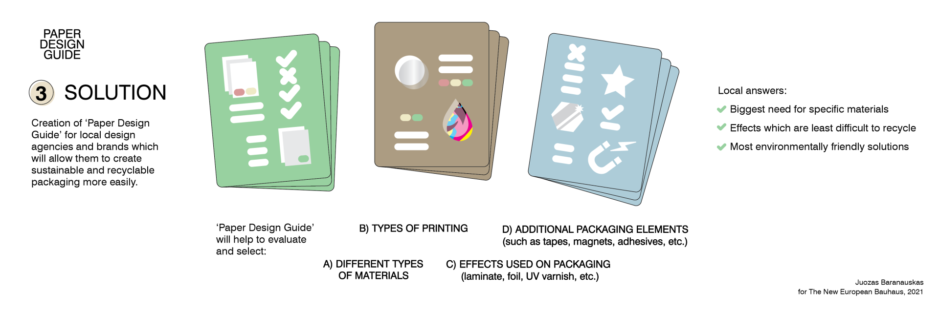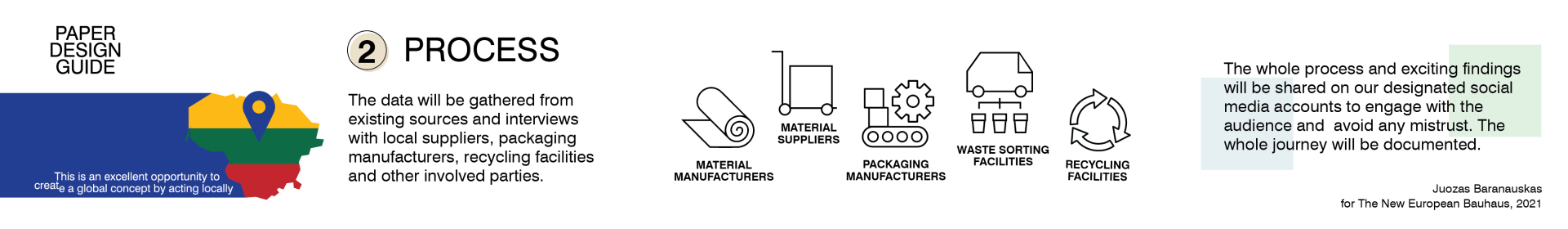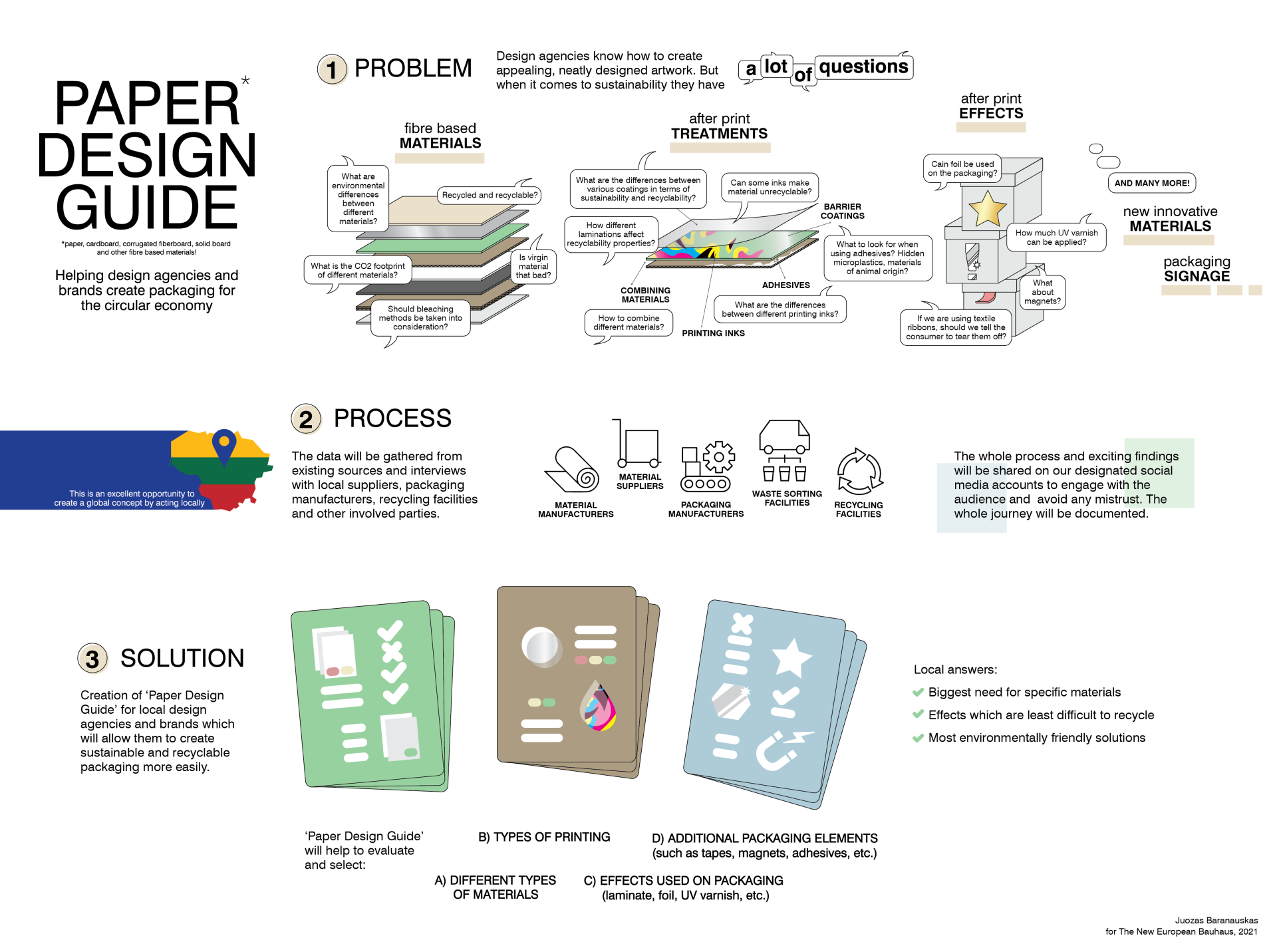 'Paper Design Guide' will allow local brands and design agencies to create sustainable and recyclable packaging more easily. The data will be gathered from existing sources and interviews with local suppliers, packaging manufacturers and recycling facilities. The guide will include information about materials, print, effects and other components that are 1) Most needed for Lithuanian recycling infrastructure 2) Least difficult to recycle 3) Most environmentally friendly.
