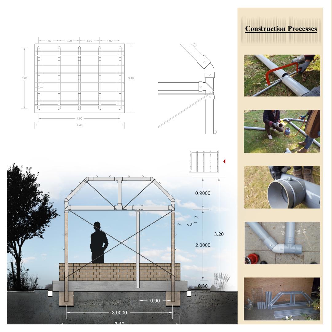 According to the concept, the design of "indigenous rural architecture" and the discussion of cheap, local, light, and portable materials was considered. in the continuation of the plica tube for the structure of the structure and the straw for the bearing structure, we found experiments designed and investigated samples designed around the world as well as the characteristics of the plica tube and the performance of these materials, which is not used in a project as a bearing structure and for the first time it has been used as the main structure of a shelter. in addition to the use of plica tube as a structure, to cement the brittle material as the main structure is a shelter that can be used in addition to structural, mechanical, and electrical facilities.