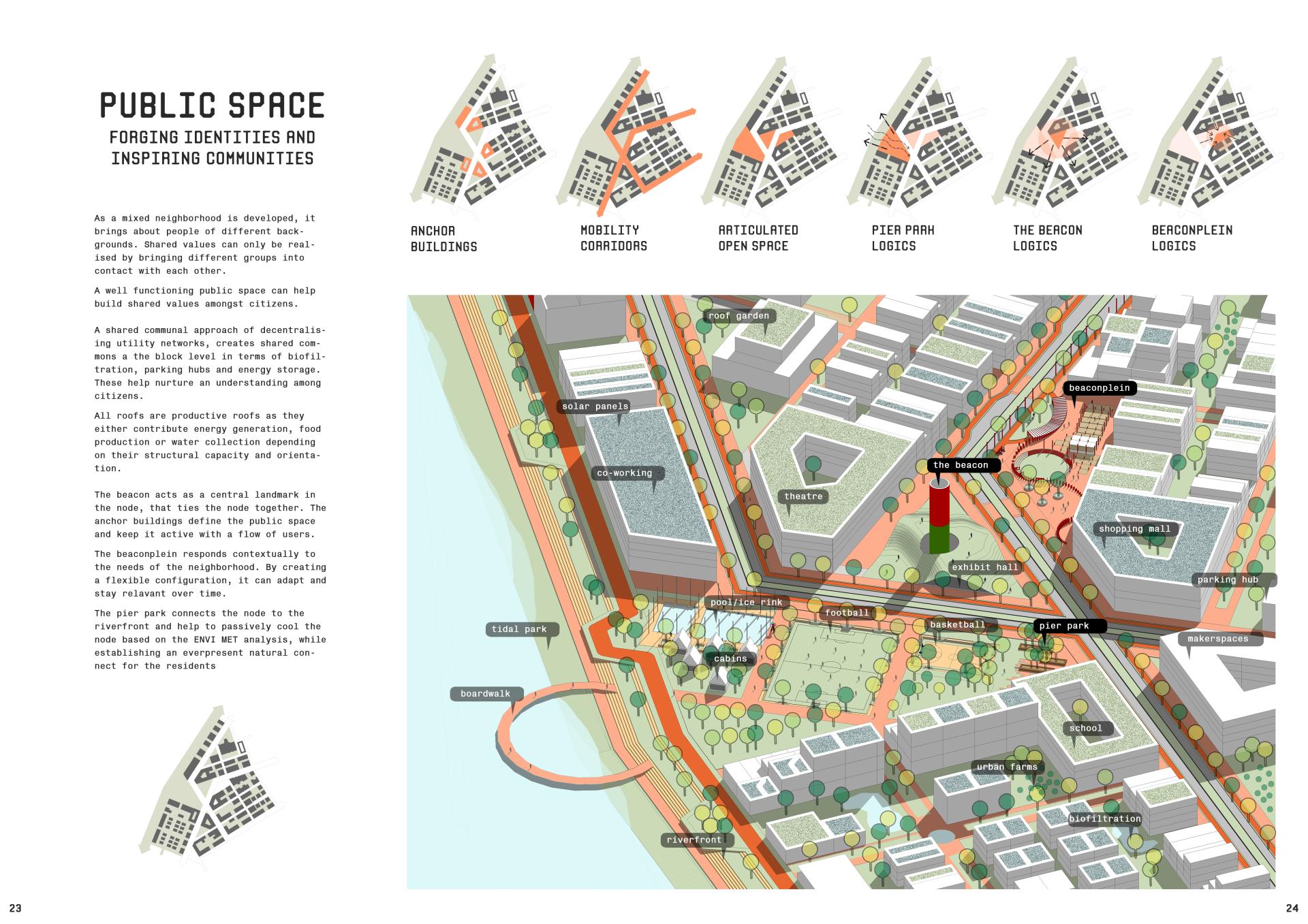The poles are designed to look industrial, reflecting the industrial past of the Merwe-vierhavens. While the materiality reflects the past, its spatial configuration is a subject of constant change reflecting the needs and demands of the present, while staying relevant for the future as well.