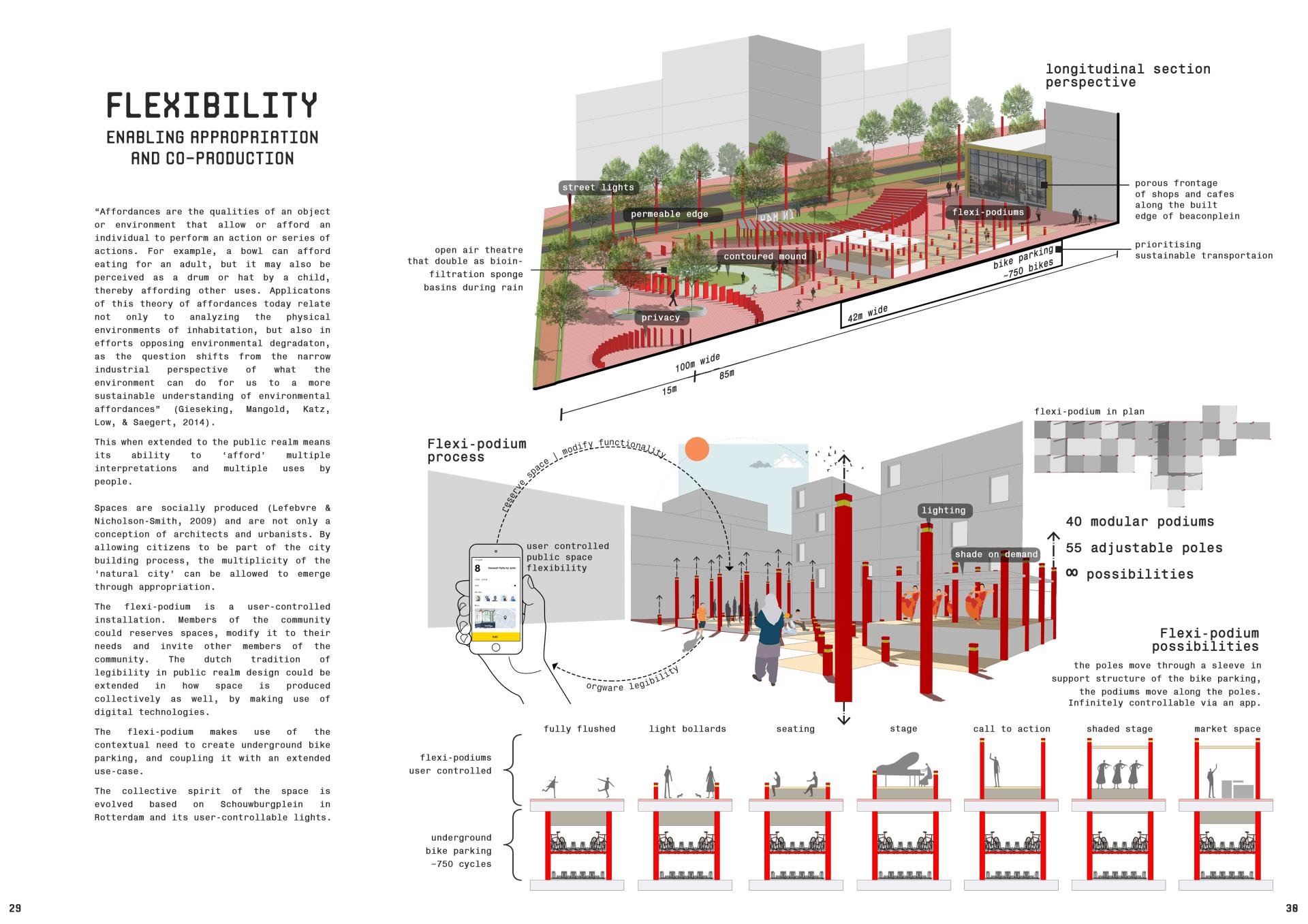 The Flexi-podium is a bike parking solution on one level and an interactive urban installation on the street level that affords the public plaza as part of the Merwe-Vierhavens redevelopment in Rotterdam to take multiple roles along its lifetime. The affordance of the space is especially important in a brown-field regeneration project such as this as the neighbourhood and the public realm find their identity and ethos over time in a shared and collective process.