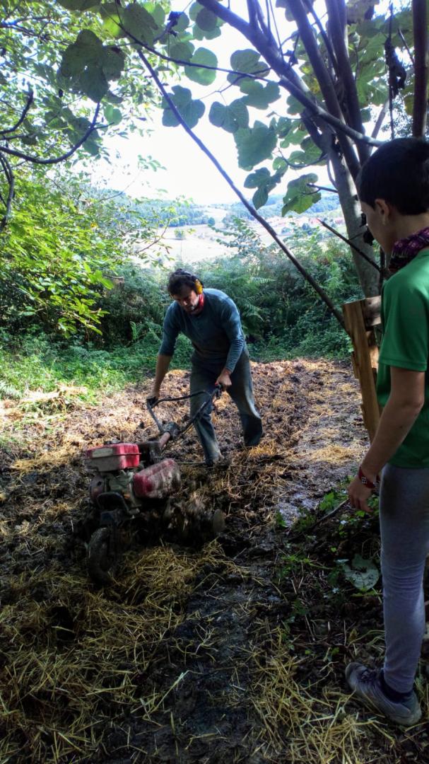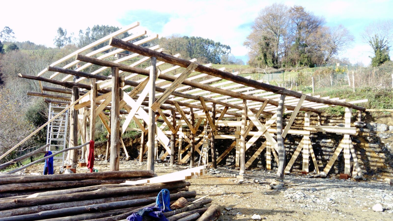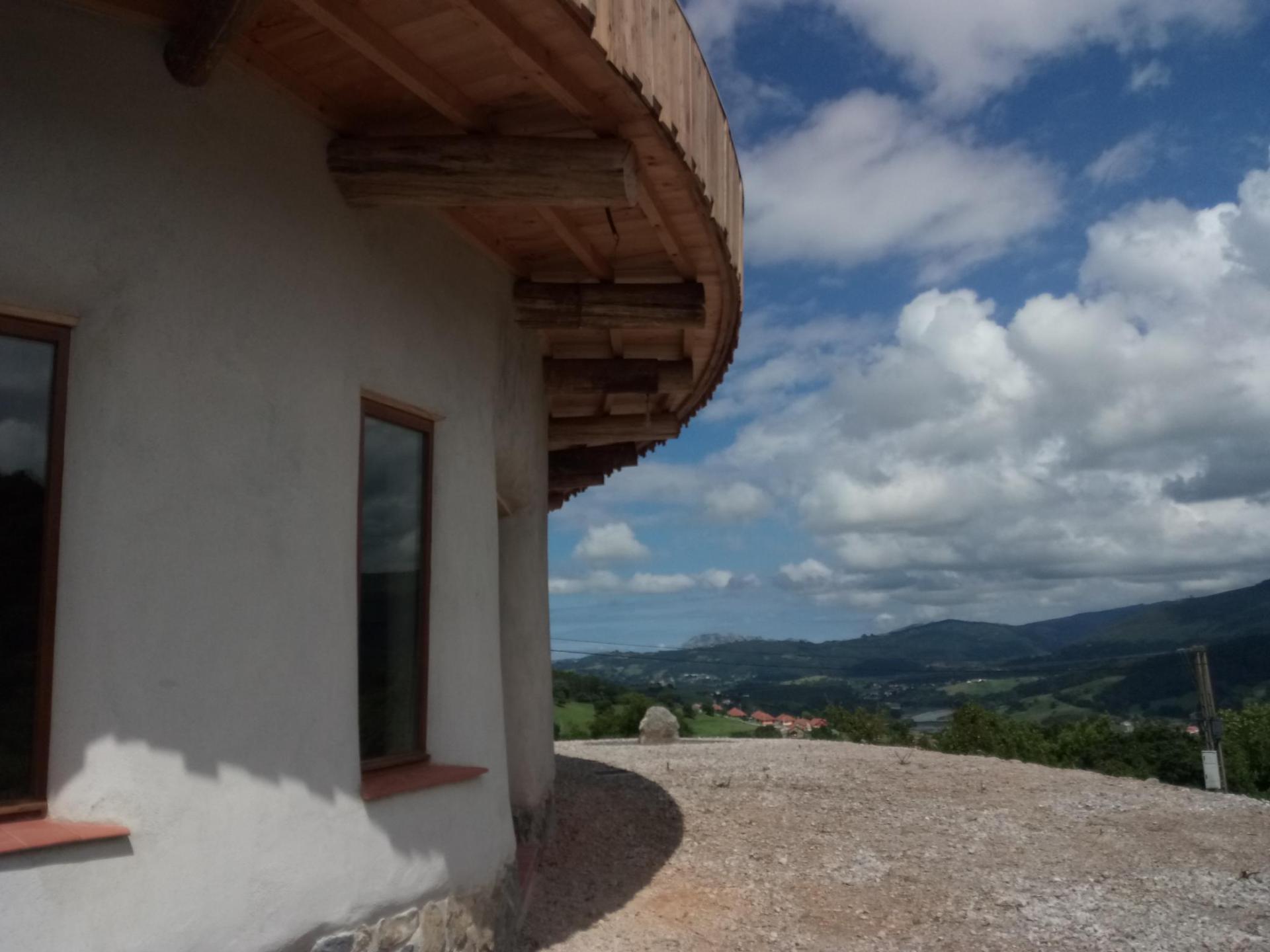 Eucalyptus globulus timber is cheap, strong, and durable if treated. It is one of the most widely available renewable resources in Cantabria (and other parts of Europe) but used for making paper, not in construction. We use round eucalyptus trunks, harvested locally, de-barked and sprayed with borax solution, to build sturdy and long-lasting structures at very low cost. Roundwood is stronger than the same cross-section of squared timber, and gives big savings in transport and processing costs. The timber fixes ~1t of CO2 per m3.