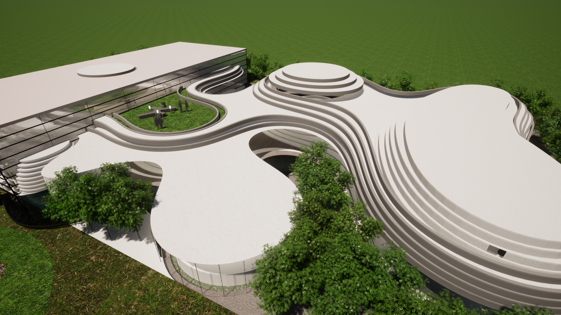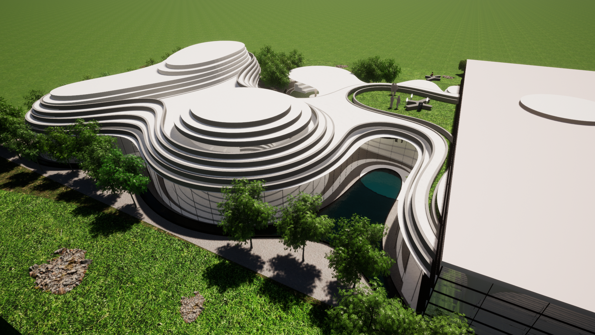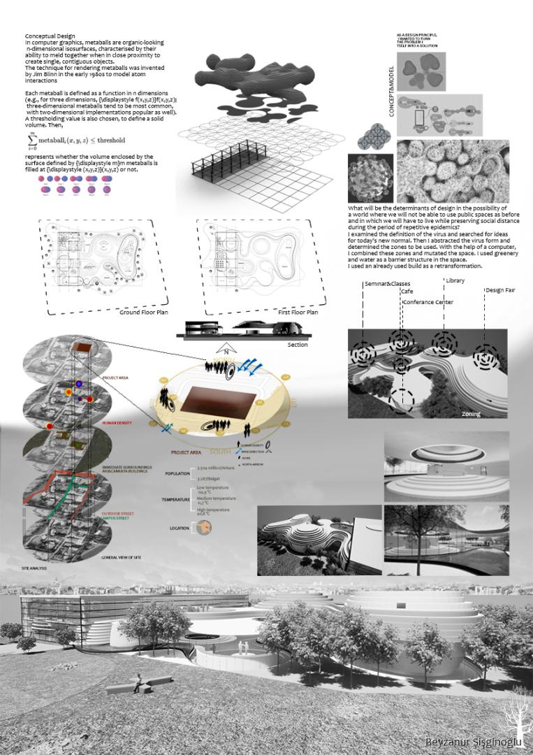 I abstracted the virus form and made a site analysis for the place I determined. I planned to build a youth centre. Because staying away from schools in the covid order was a problem for me. I determined zones and transformed them into spaces with the help of a computer. I got help from the computer for this, I processed the metaball form into my space. I kept the area of use wide in terms of being suitable for social distance. I reconciled the flat ready-made building to today's conditions by giving it a mutated appearance.