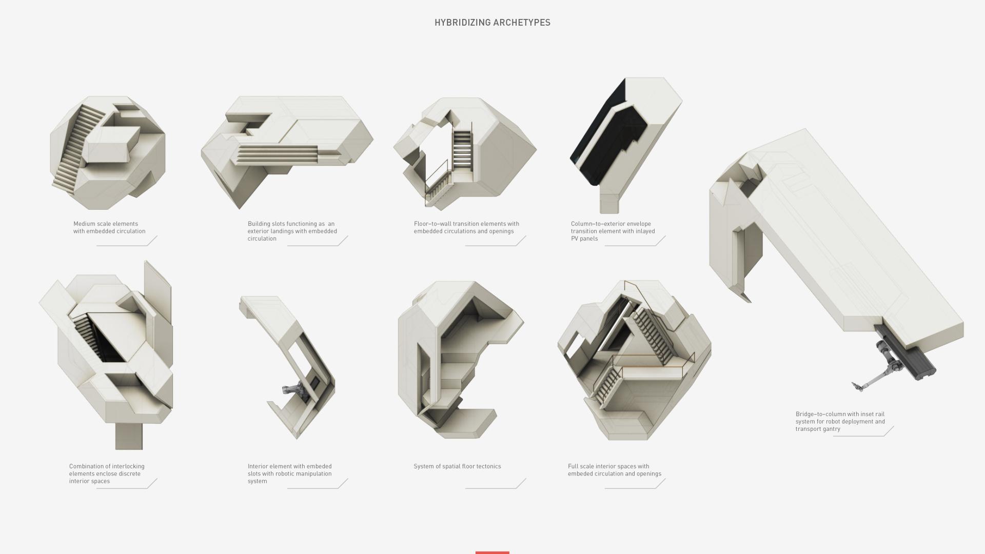 The tectonics are based on an interlocking logic applied to a set of discrete architectural elements. It is based on details of classical carpentry joining systems and interlocking assembly of traditional japanese wood joinery techniques. These two systems are supersized into architectural scale of building elements. By following same ruleset of interlocking logic, a production of non-standardized yet tectonically compatible artisanal building elements is achieved. These custom pieces question the traditional understanding of construction archetypes (1) experimenting with hybridization of functions (2).