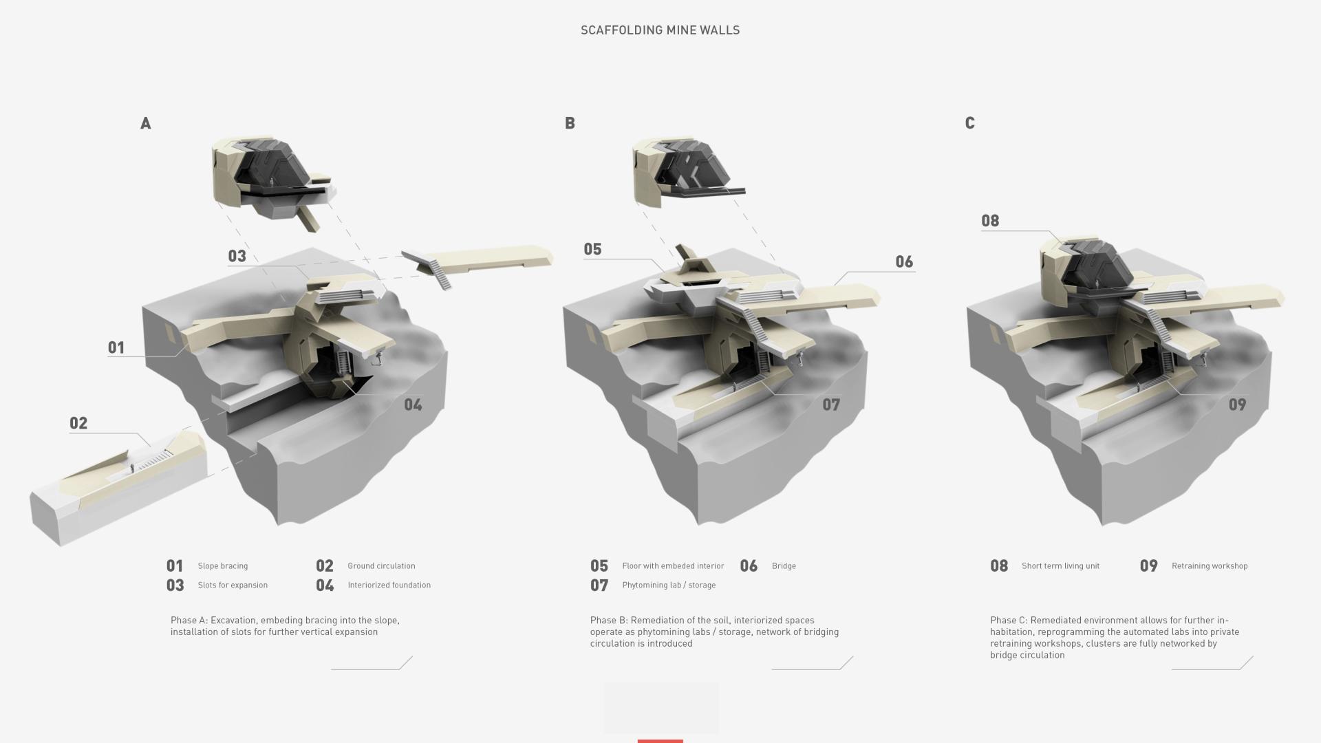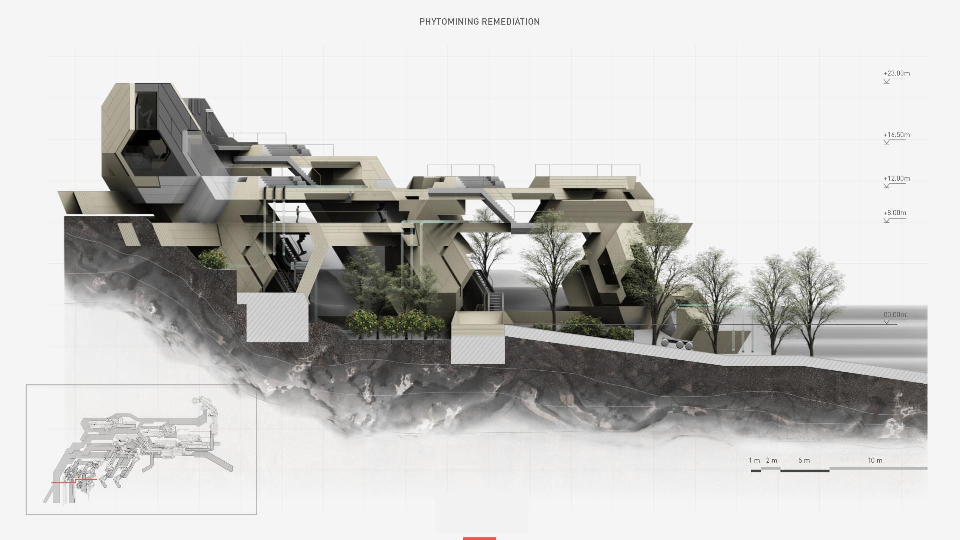 Through a strategy for both ecological and societal scenarios this project investigates a future of sustainable timber production in which machine is performing most of the mechanically demanding actions. Due to the current implementation of digitisation processes (1) in the timber production industry the material production can smartly adapt to the current demand without exploiting locally available volumes. Focusing on problematic of ore extraction, project speculates on using a remediation strategy which includes sustainable co-shared forestry model and utilization of hyperaccumulating plants for ore extraction with a longterm goal of remediating the devastated land. The outlined strategy consist of 5 phases: Remediation (2), Production (3), Processing (4), Fabrication (5) and RnD (6). The miners that previously operated the mine retrain within the newly built facility to become digital craftsmen.