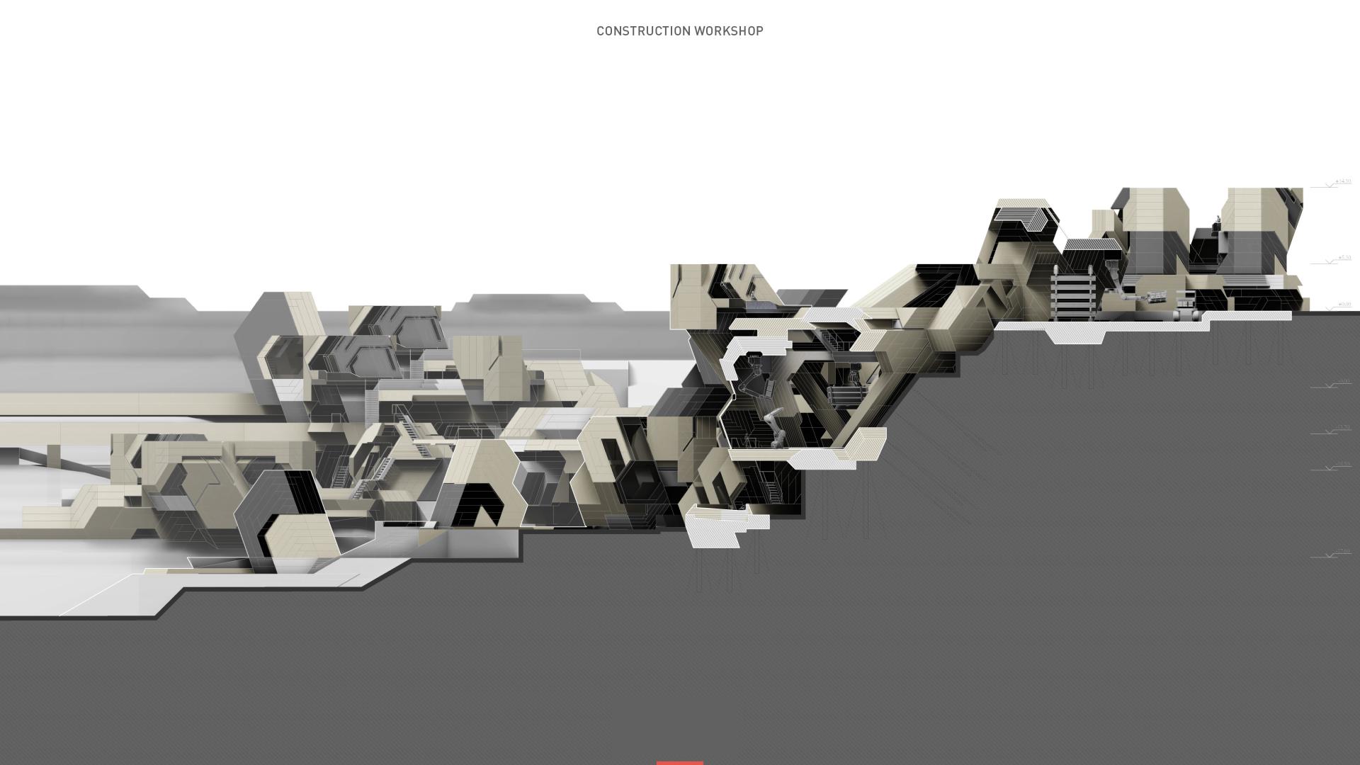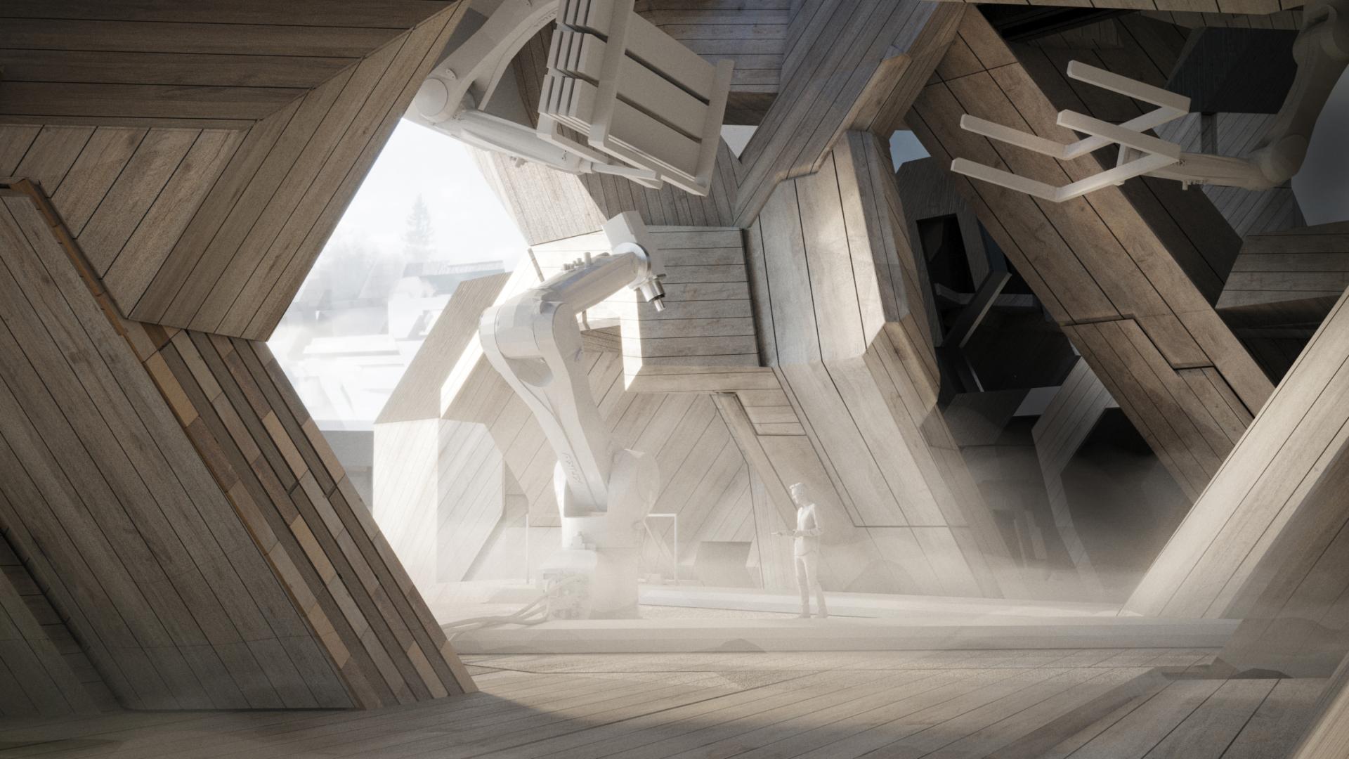 Outcome is a synthesis between methods of sustainable harvesting and maintenance of the natural habitat with an architectural program focusing on a man—machine collaboration which aims at (re)training blue collar workers in using digital fabrication tools. Current fears in regards of the automation’s effect on the labour market are thus offset in perspective of new collaborative opportunities.