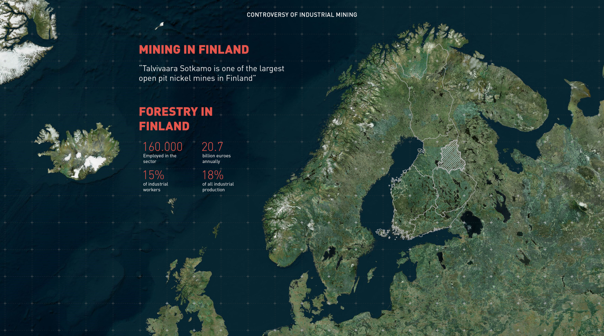 Through a development of a long term strategy for both ecological and societal scenarios project framework investigates a future of sustainable timber production, in which the machine is co–performing with a human in a production of digitally crafted system of interlocking discrete building elements made out of localy produced CLT (cross-laminated timber). Proposed system enables mass–customisation over mass–production while reversing industrial footprint in the area of highly polluted nickel mine in Europe, the Talvivaara mine (Kainuu region, Finland). This is done so by devising a remediation strategy that introduces a sustainable co-shared forestry model and usage of nickel accumulating („hyperaccumulating plant species“) plants for cleaner nickel extraction and remediation of the devastated land.