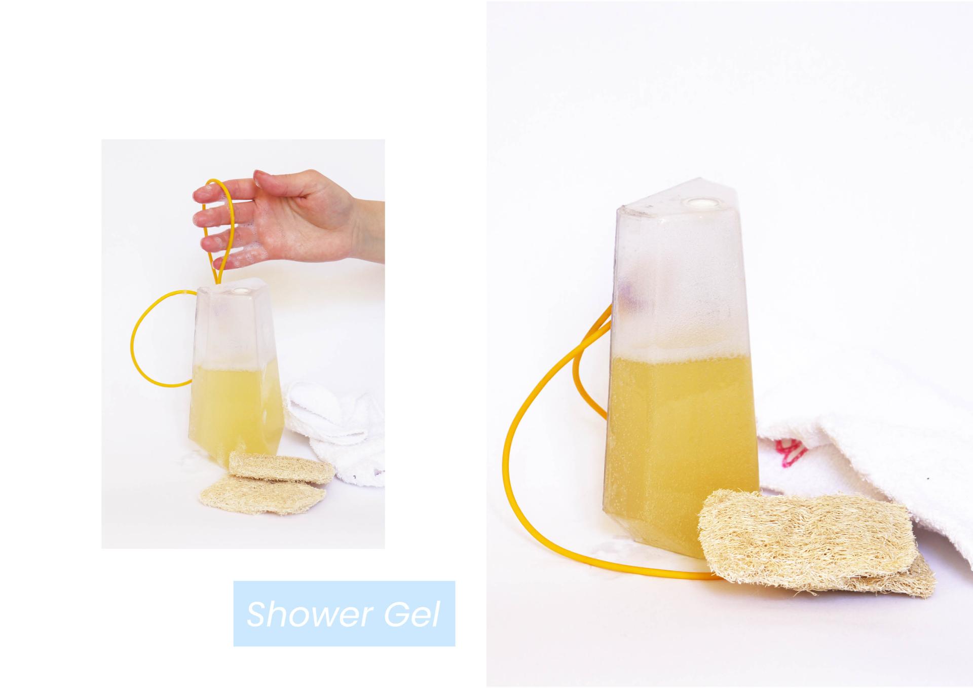 Cristilo deliberately stands out due to its angular shape in order to serve the wearer as an accessory and to attract the viewer from the outside as an eye-catcher. Thanks to the transparent material, the user can “adjust” the color individually by adding different detergents, shower shampoos, gels and so on. The reusable bottles are customizable by combining them with different straps which vary in color and material. This way, the desired aesthetic is achieved, showing the user’s own style.