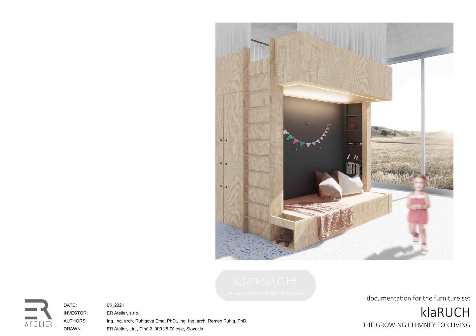 The main innovative benefit of the KlaRUCH residential chimney is the connection between the themes of sustainability, ecology, minimalist way of life and Montessori principles. These themes all met in a non-violent way, and thanks to the current design, compactness and variability, they can appeal to a wide group of people dealing with the first family living together and the equipment of a children's room. In one piece of furniture there is all the necessary equipment of a children's room, which is very easily modified into a room for an adolescent, or even an adult coming to visit with his young family.