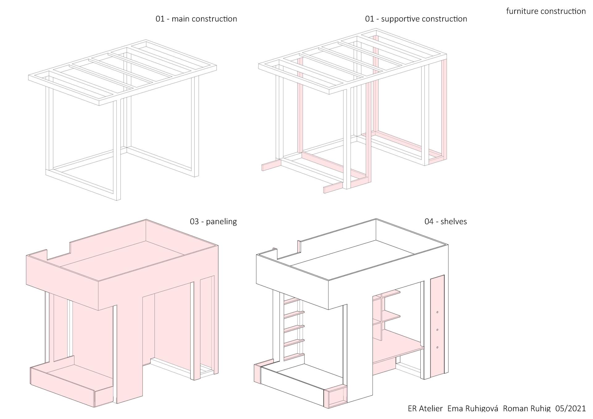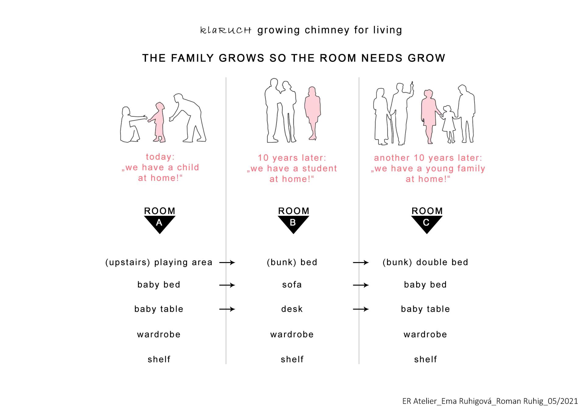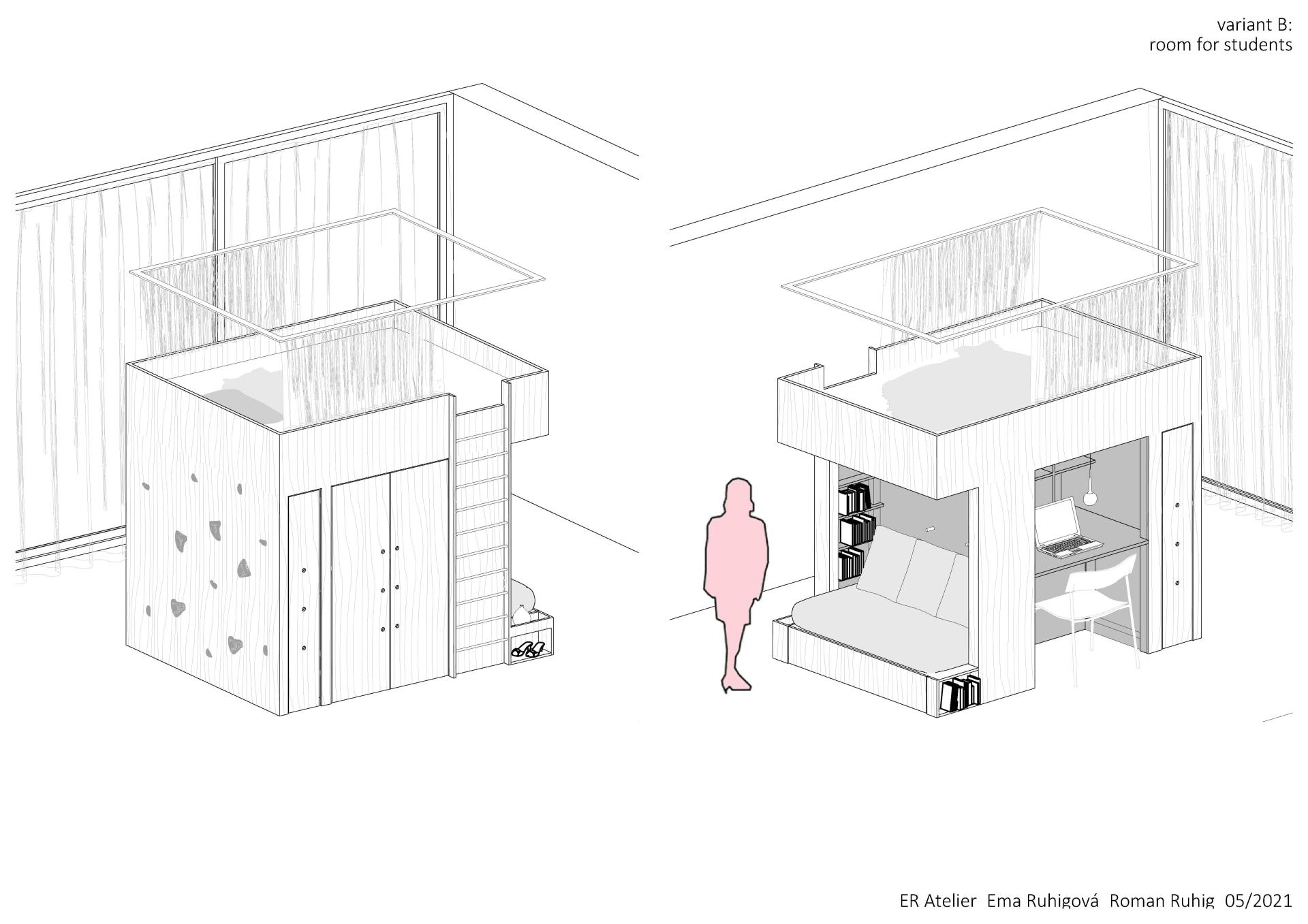 The main intention in the design of The KlaRUCH growing chimney for living was to meet the requirement for variability of its placement. Thanks to its compact shape, this furniture can be placed against the wall as well as in the free space, which also gives the possibility of applying a climbing wall. The individual segments of which it is composed represent a complete room equipment for one member of the household with whom he can grow. Thanks to simple and reversible modifications, it is possible to vary three variants of use: