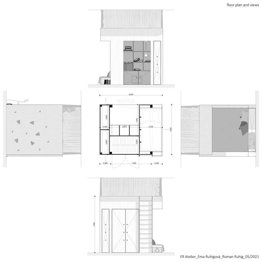 The KlaRUCH is one piece of furniture that contains all the necessary equipment in a child's room and grows with it. It includes a safe play area on a raised platform, a climbing wall, a sleeping area, a study area, as well as storage space for clothes and books. It effectively uses the entire height of the room, thanks to which it takes up a minimal floor plan dimension and is therefore placeable in any space. During the child's life, it adapts to his needs by simple (reversible) modifications.