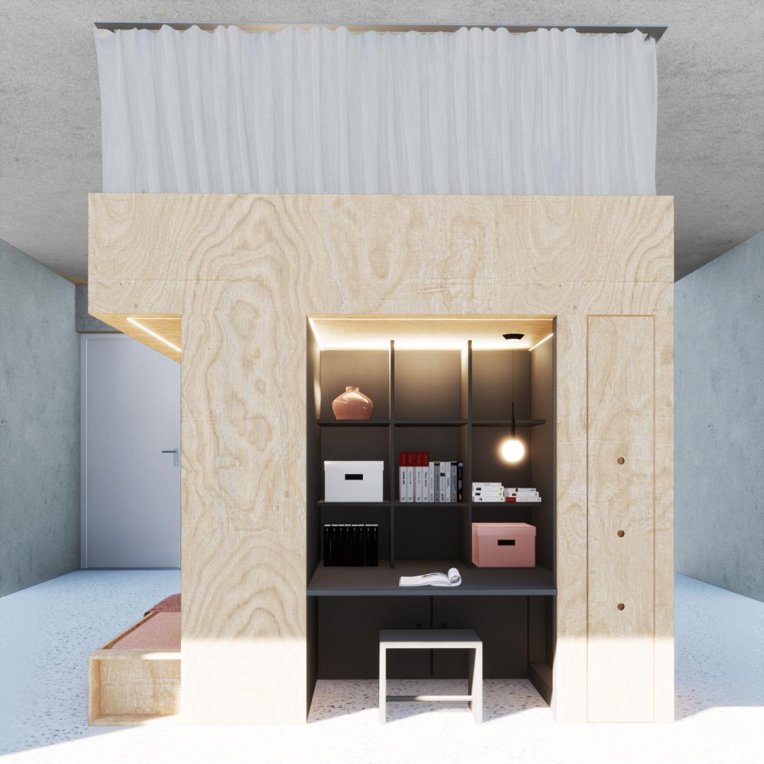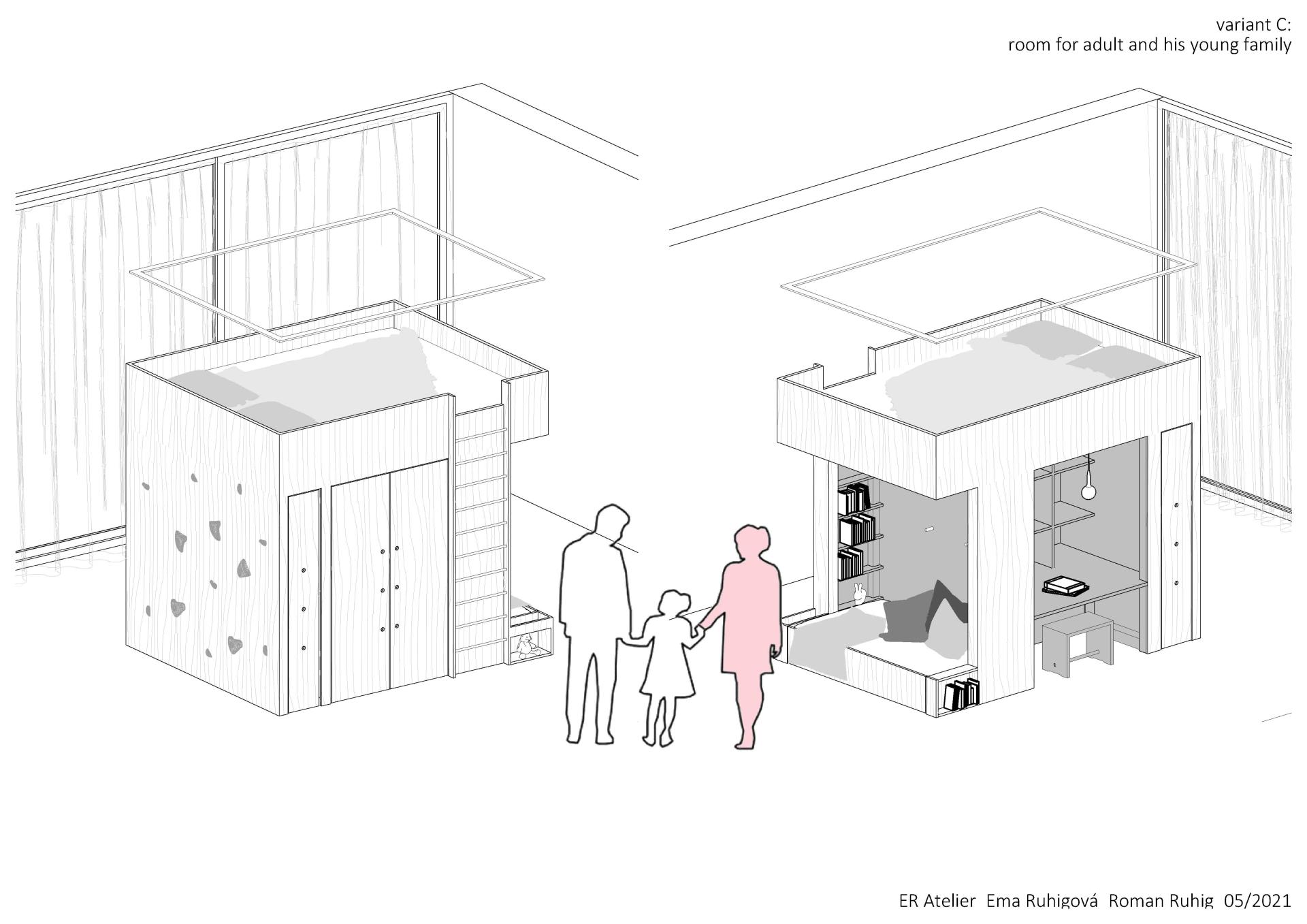 The work table is at a lower level and the mattress of the baby bed is placed just above floor level so that the baby bed is always available. The storage spaces have adapted handles so that the child can reach and be able to make full use of the space. The raised platform is used as a bed in the next stages of furniture (Variant B). The grate of the cot is raised and serves as a sofa / couch for relaxation. The work table is also raised to a height suitable for a classic desk. In variant C, it is assumed that the original occupant of The KlaRUCH growing chimney already has his own family and the room is used as a guest room. Then a double bed is placed on a raised platform and the couch is returned to the lowered position to place a cot for the next generation of users.