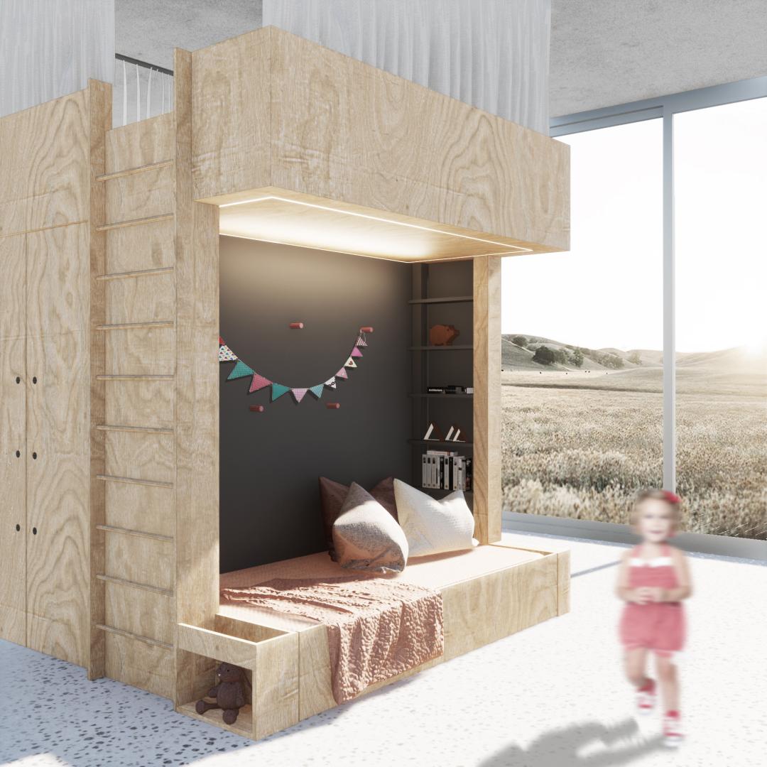 The space of a low bed for a small child can be easily transformed into a living space for a rest and relaxation in the form of a sofa. The desk also has two worktop positions, so it can serve as a children's desk for creative work, as well as a full-fledged desk. The raised space serving as a (double) bed at a later age can be used as an additional safe play area in childhood, so that from the child's point of view and the requirements for sufficient play space, it does not take up any square meters in the room. Of course, there are also open and closed storage spaces present in all variants of this Growing chimney. At the same time, the fundamental idea in the design was to ensure Montessori requirements for the healthy psychomotor development of its inhabitants. The design of the handles and patents for opening the storage space was adapted to this, as well as the height accessibility of the bed for children. This idea is supported by the playfulness of the concept - a climbing wall and a ladder leading to a raised platform. The KlaRUCH growing chimney itself thus creates various nooks and crannies in the room - either in its own cube or in its surrounding space.