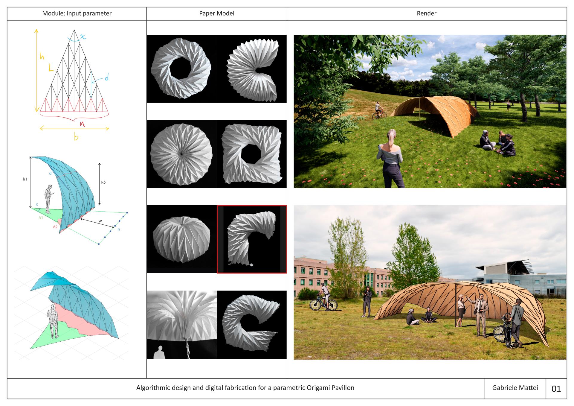 The object of this proposal is the design of a rigid panel origami structures supported by parametric modelling and digital fabrication. The starting point is the identification of a triangular origami module whose crease pattern is of Yoshimura type. This module is then replicated in the space according to the construction needs. In order to explore the possible combinations of this module, some configurations have been proposed by either using paper models (see panel 1) or realizing MDF (medium-density fiberboard) prototypes in scale 1:5 and in scale 1:10 using a laser cutting machine (see panel 2).
